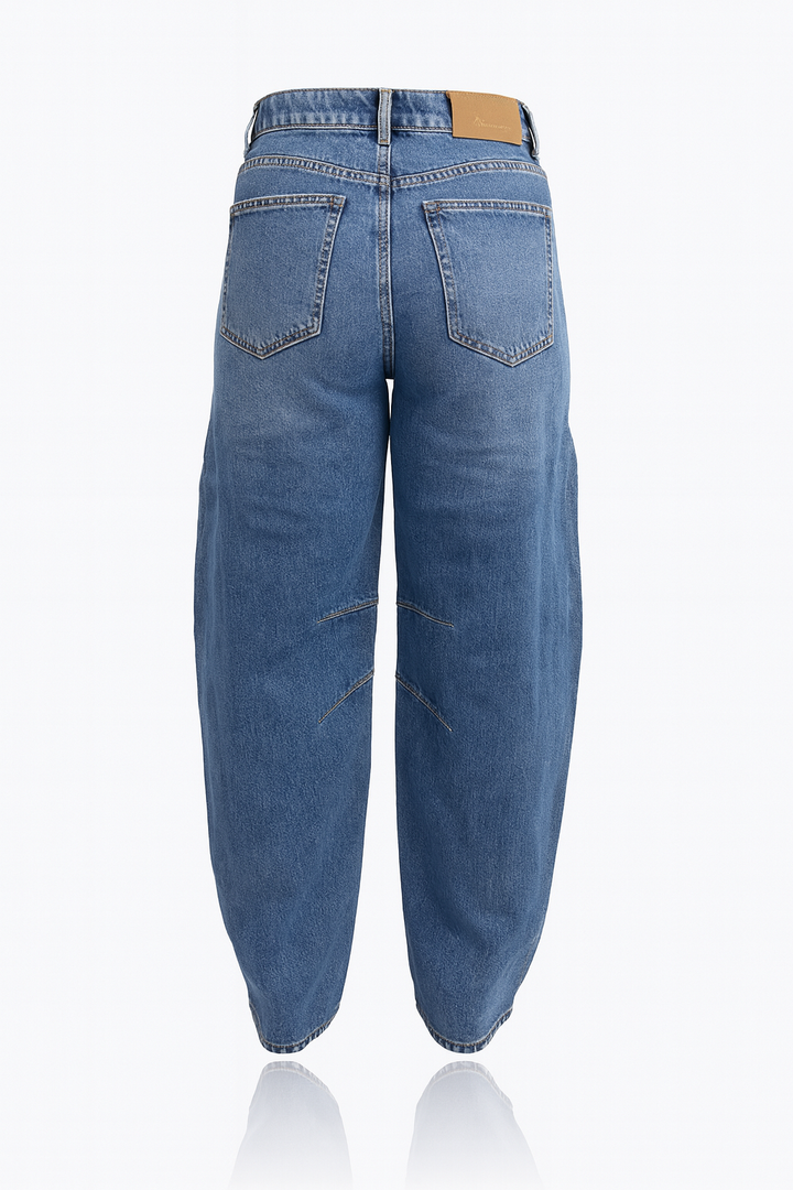 Jean cargo de tiro alto en denim azul medio, con pierna ancha y costuras decorativas. Cómodo y moderno, ideal para looks casuales con estilo.