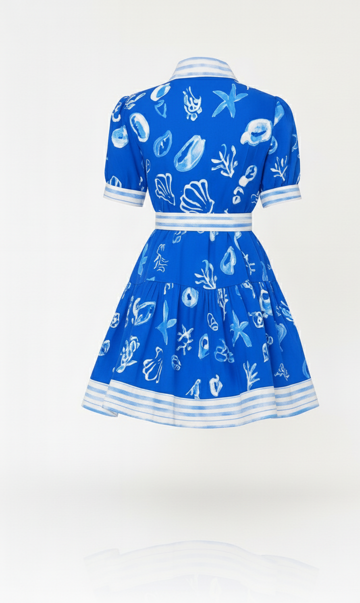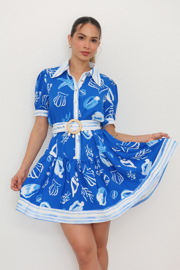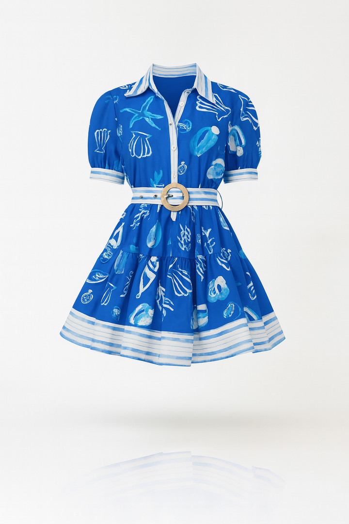 Short shirt dress with a navy print in shades of blue and white. Designed with short puff sleeves, a classic collar, and a button-front closure. The flared skirt adds movement, while the belt with a wooden buckle stylizes the silhouette. A sophisticated and fresh option for summer looks.