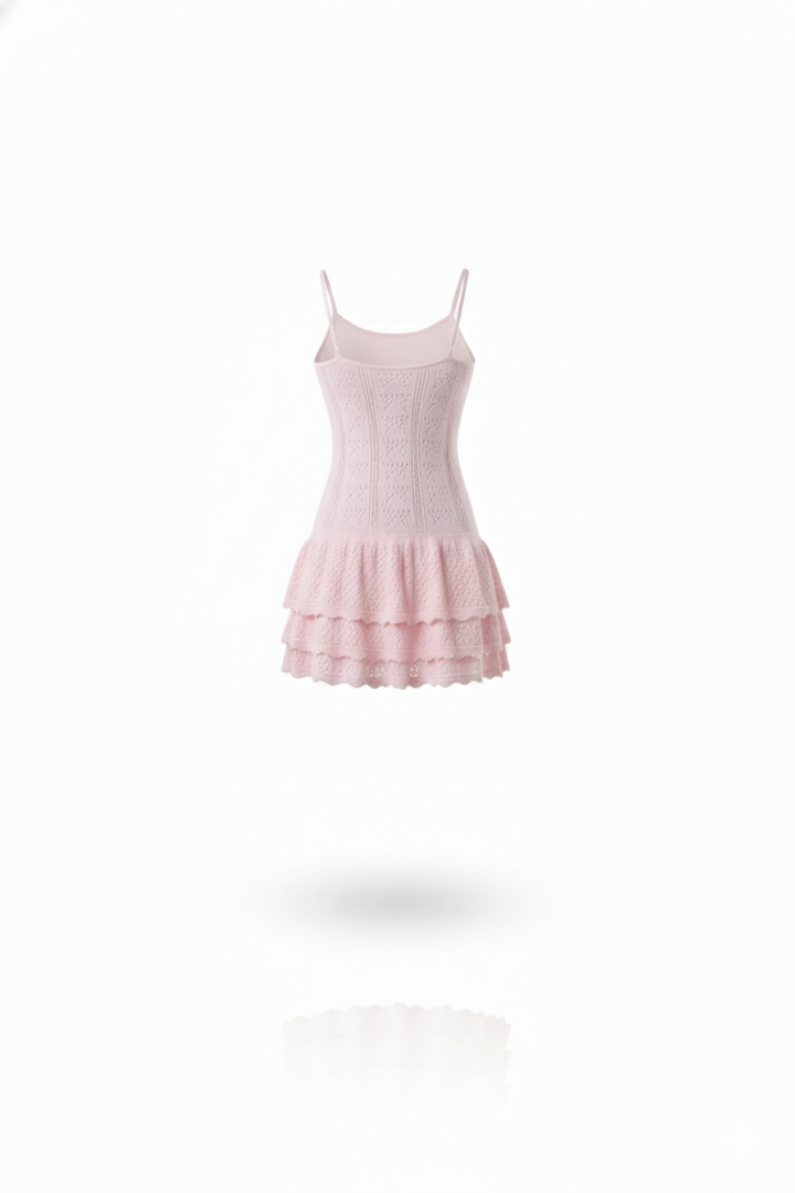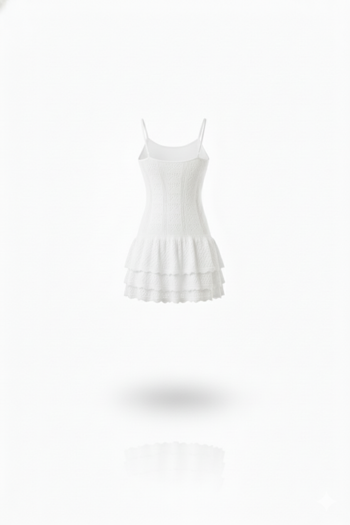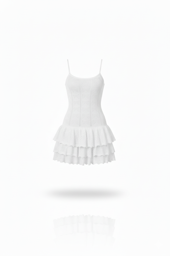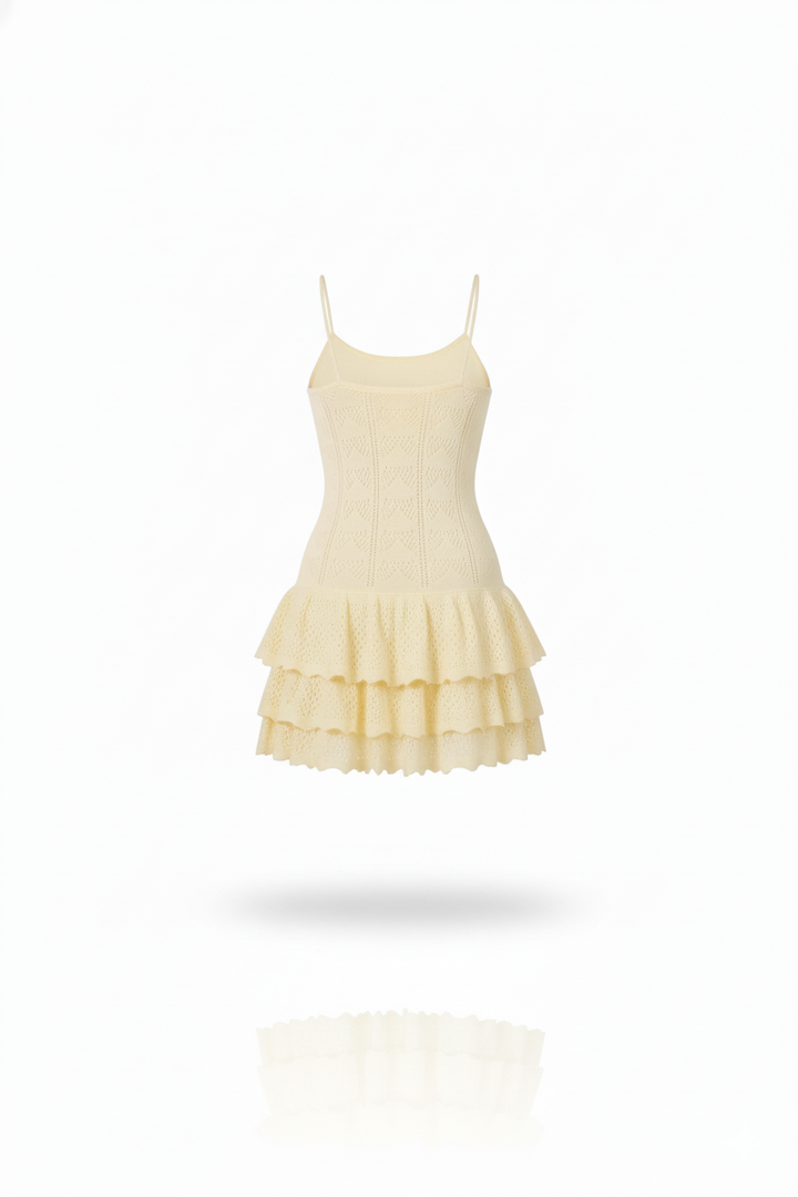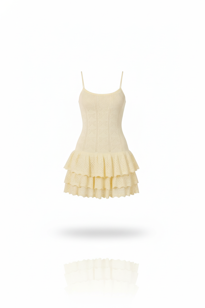 This ivory knit dress combines elegance and delicacy in a sophisticated design. With thin straps and a fitted top, it highlights the figure in a subtle and refined way. The skirt, with lace details and ruffles, adds a feminine and romantic touch, maintaining a balance between freshness and distinction. Complemented with accessories in neutral tones, this look is ideal for special occasions where you want to project a polished and harmonious image, without sacrificing comfort or modernity.