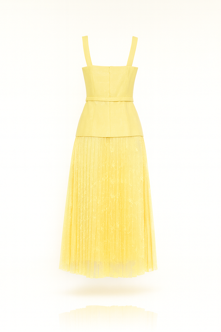 This beautiful dress fuses the structure of tweed on the top with the delicacy of lace on the skirt. Its straps and straight neckline flatter the figure, while the matching belt enhances the silhouette. The pleated skirt with floral lace details adds a touch of romance and movement, making it a