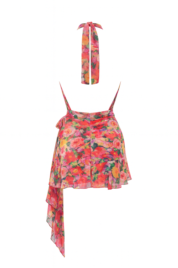 This fitted dress, crafted from cotton fabric, features a vibrant floral print with warm tones. Its halterneck design highlights the open back, while the asymmetrical cut and side tie detail add a dynamic and sophisticated touch. Perfect for a fresh and elegant look.
