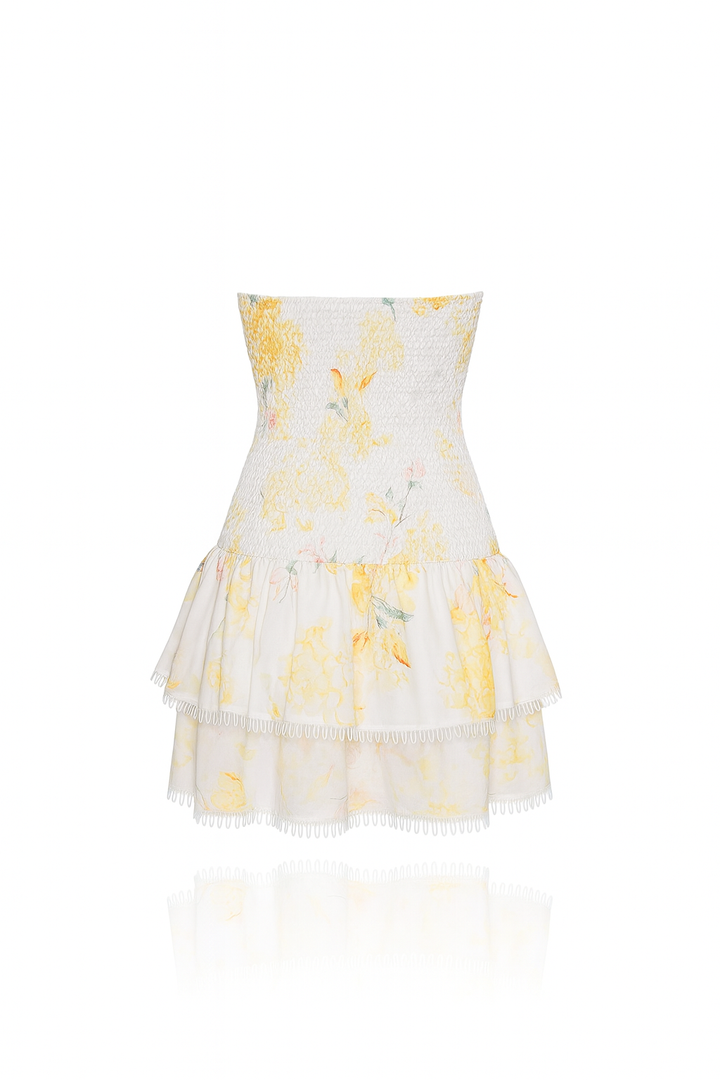 Vestido corto tipo strapless con cuerpo smock y estampado floral en tonos amarillos. Su falda con vuelo y detalle de borlas añade un toque coqueto y femenino