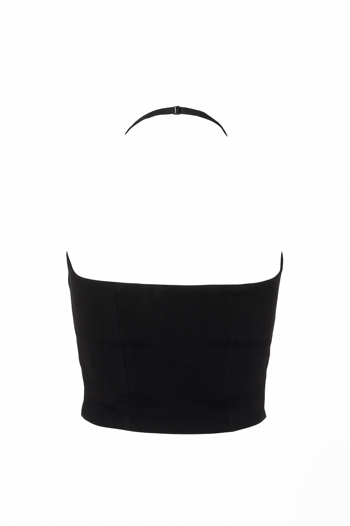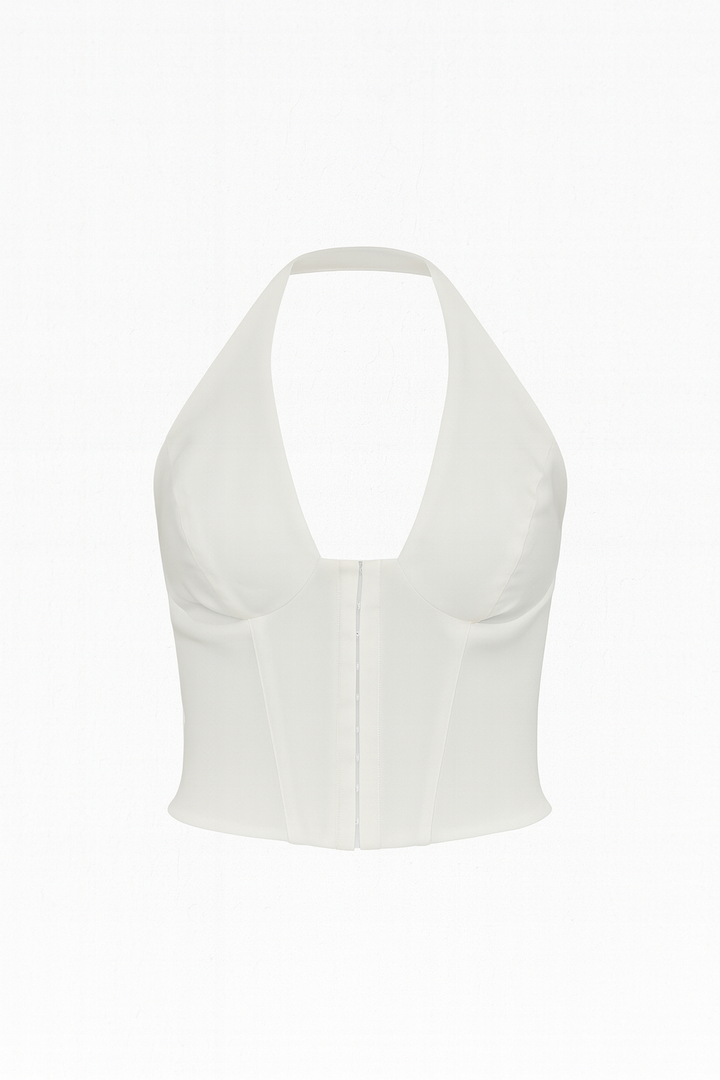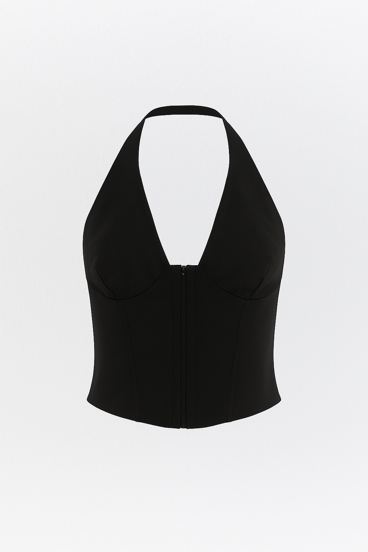 Blusa halter tipo corset en tela satinada estructurada, con escote profundo y cierre frontal. Realza la figura con un estilo moderno y elegante, ideal para cenas, eventos o salidas nocturnas.