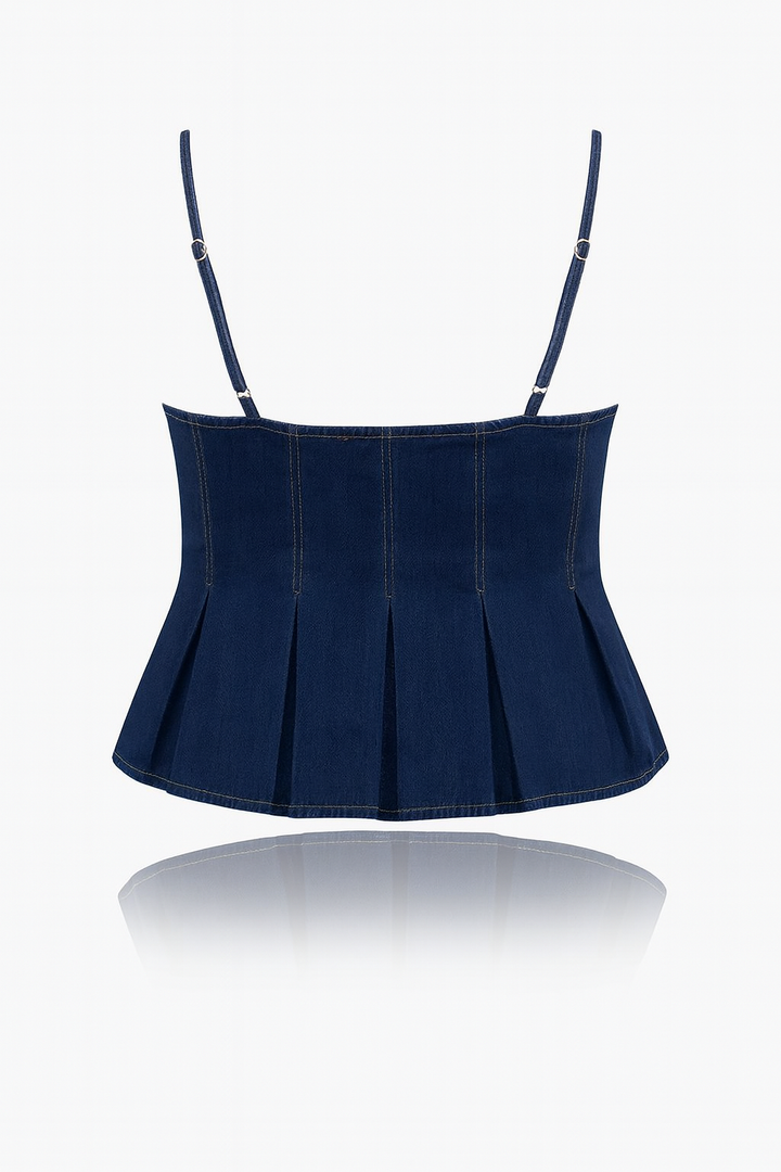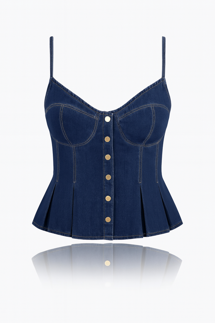 Blusa denim tipo bustier, de tiras delgadas y botones dorados frontales. Su diseño con pinzas y caída en forma de pequeños pliegues realza la figura con un toque moderno y femenino.