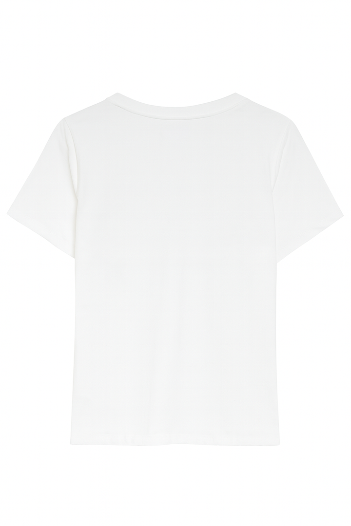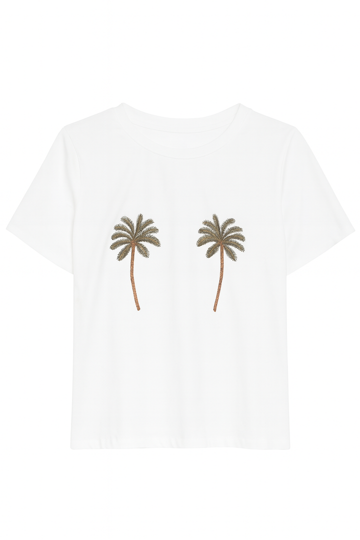 Blusa camiseta blanca presenta un diseño fresco y divertido con bordados de palmeras en la parte frontal, ubicadas de manera simétrica a la altura del busto.