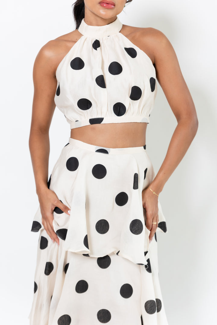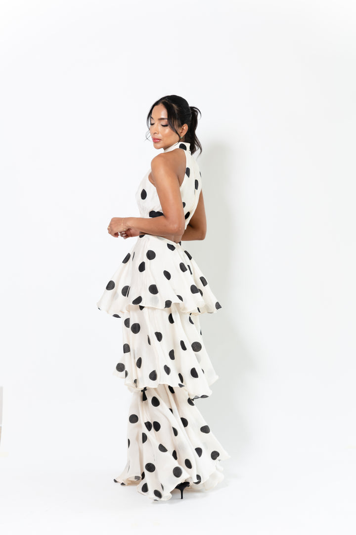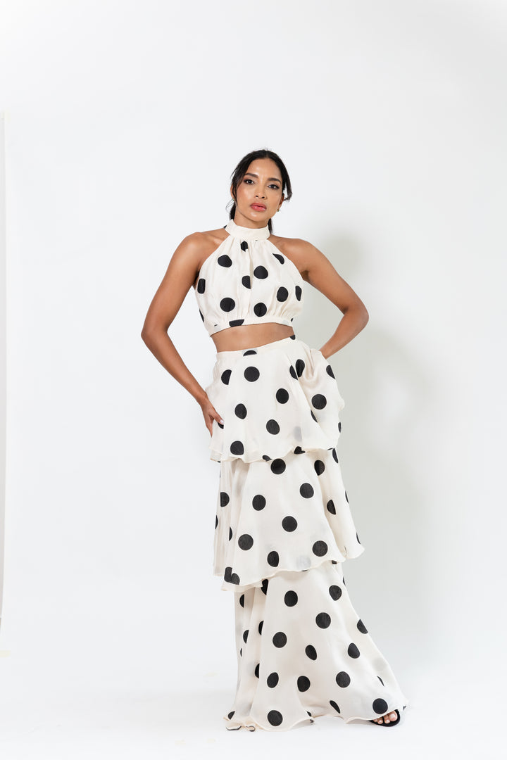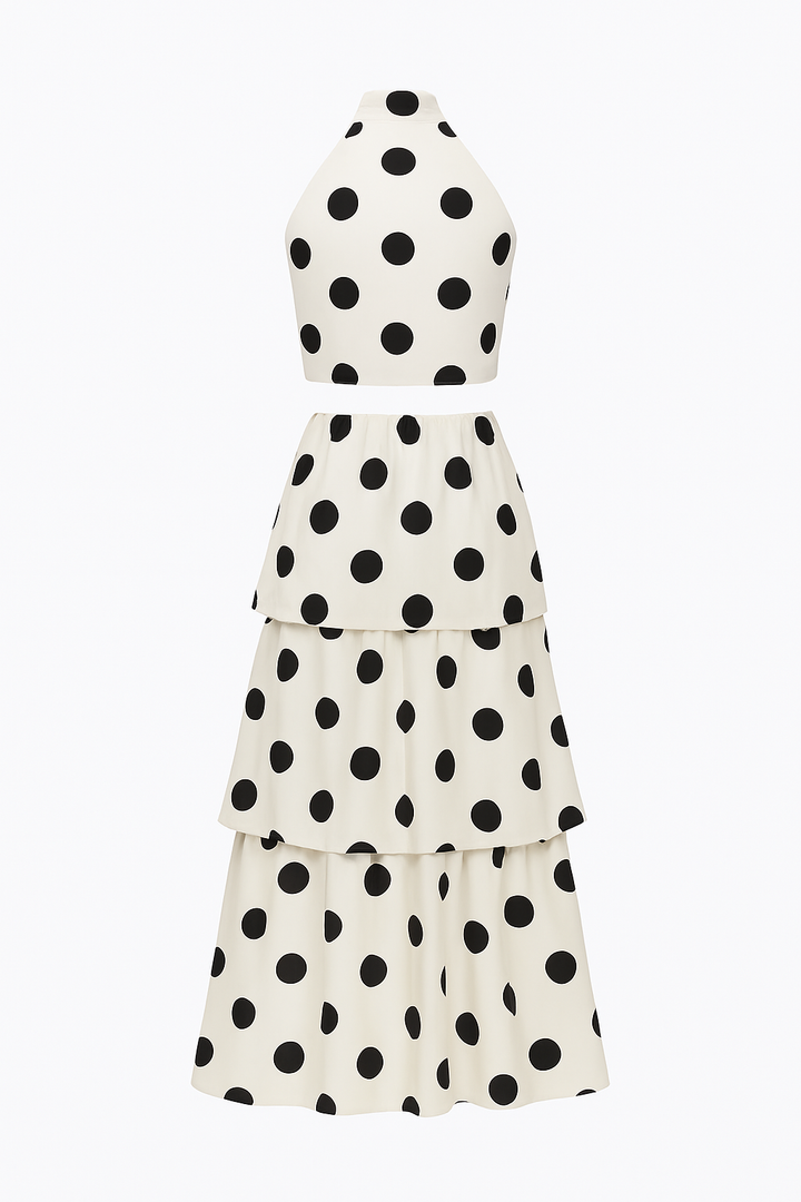 Set en lunares con top halter y falda larga en capas, un look sofisticado y moderno que roba miradas.