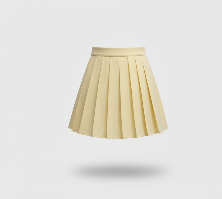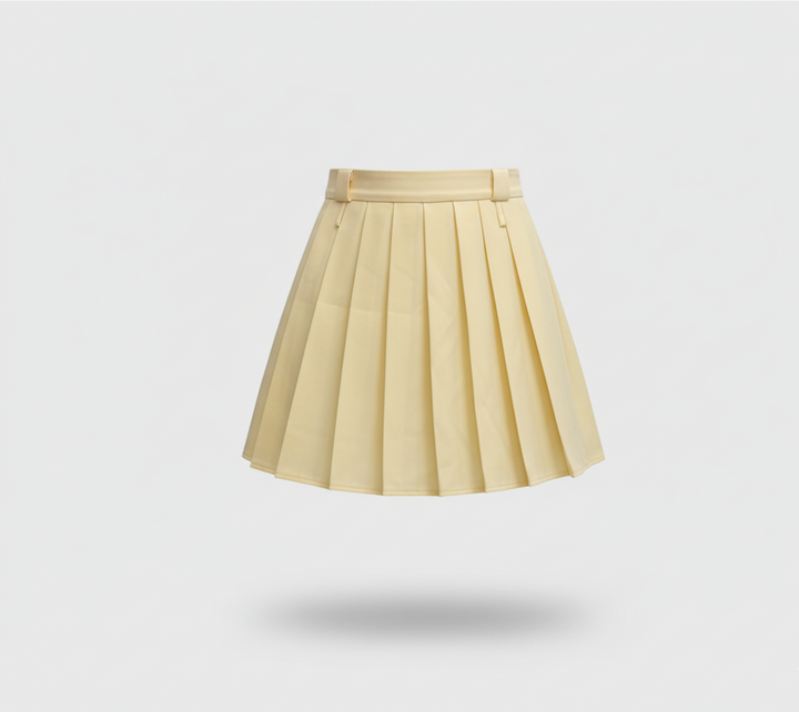 falda tableada con un estilo fresco y juvenil, perfecta para dar un toque coqueto y moderno a cualquier look. Está confeccionada en tela estructurada color vainilla suave, que mantiene su forma y aporta un acabado limpio y femenino.