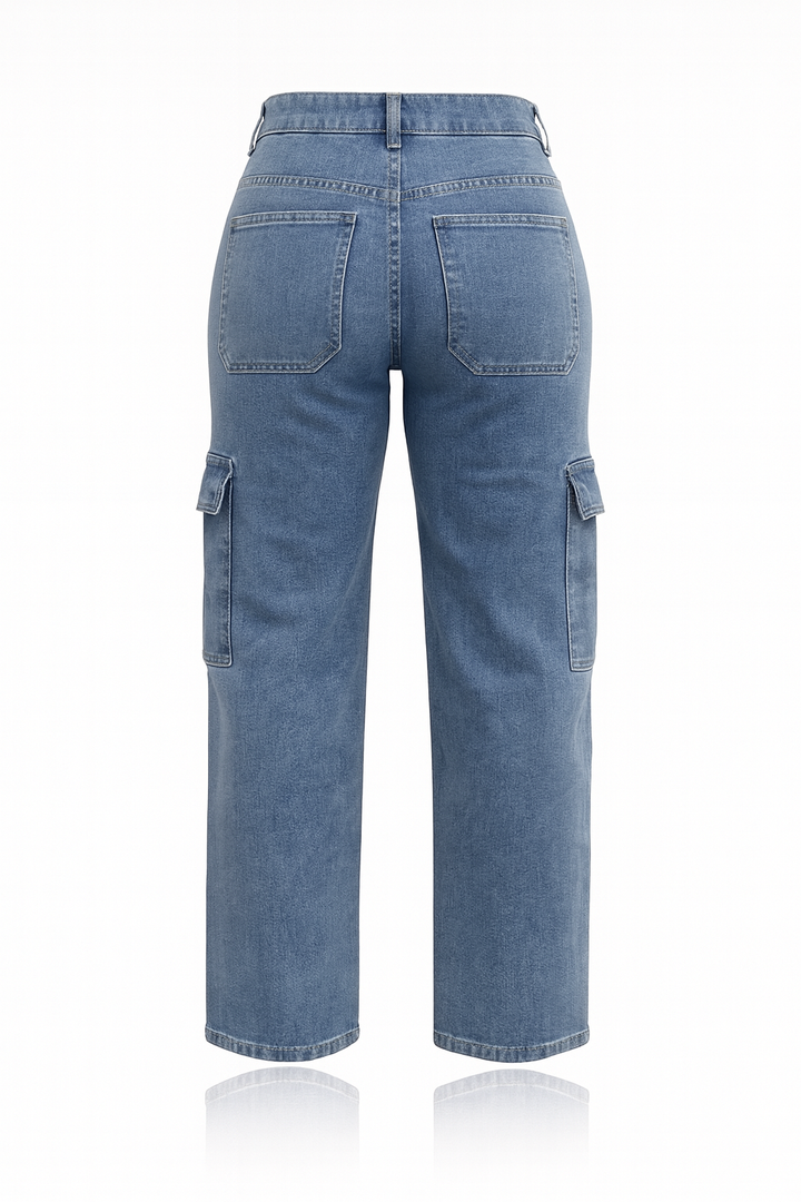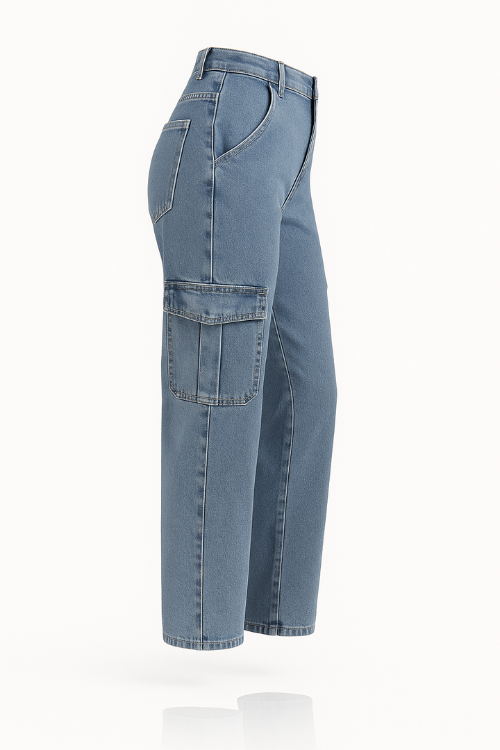 Jean estilo moderno y cómodo, con tiro alto y corte recto. Su denim azul claro y los bolsillos laterales tipo cargo le dan un aire urbano y versátil.