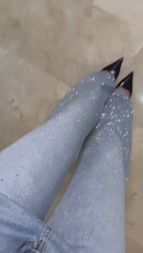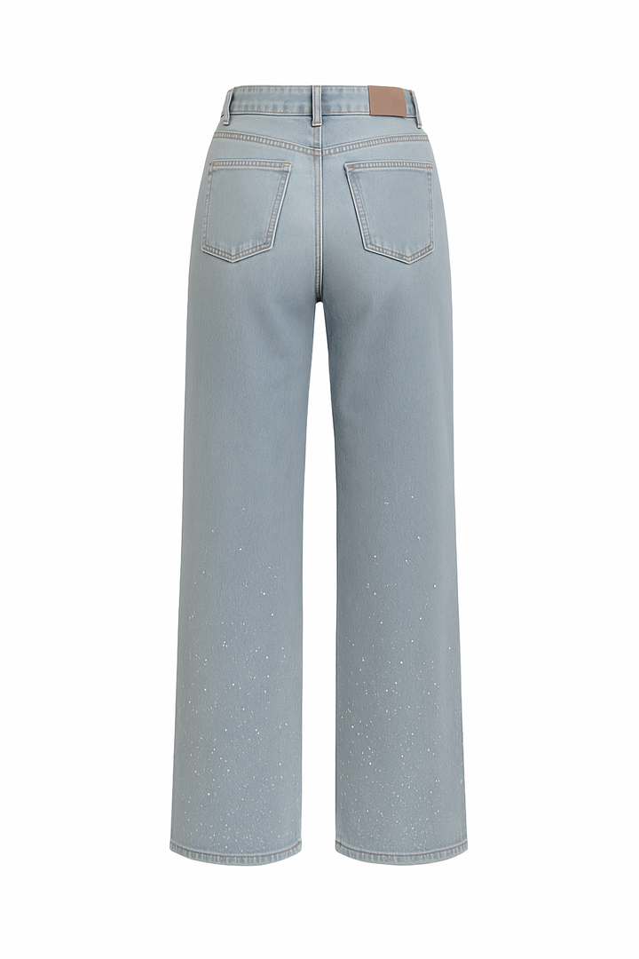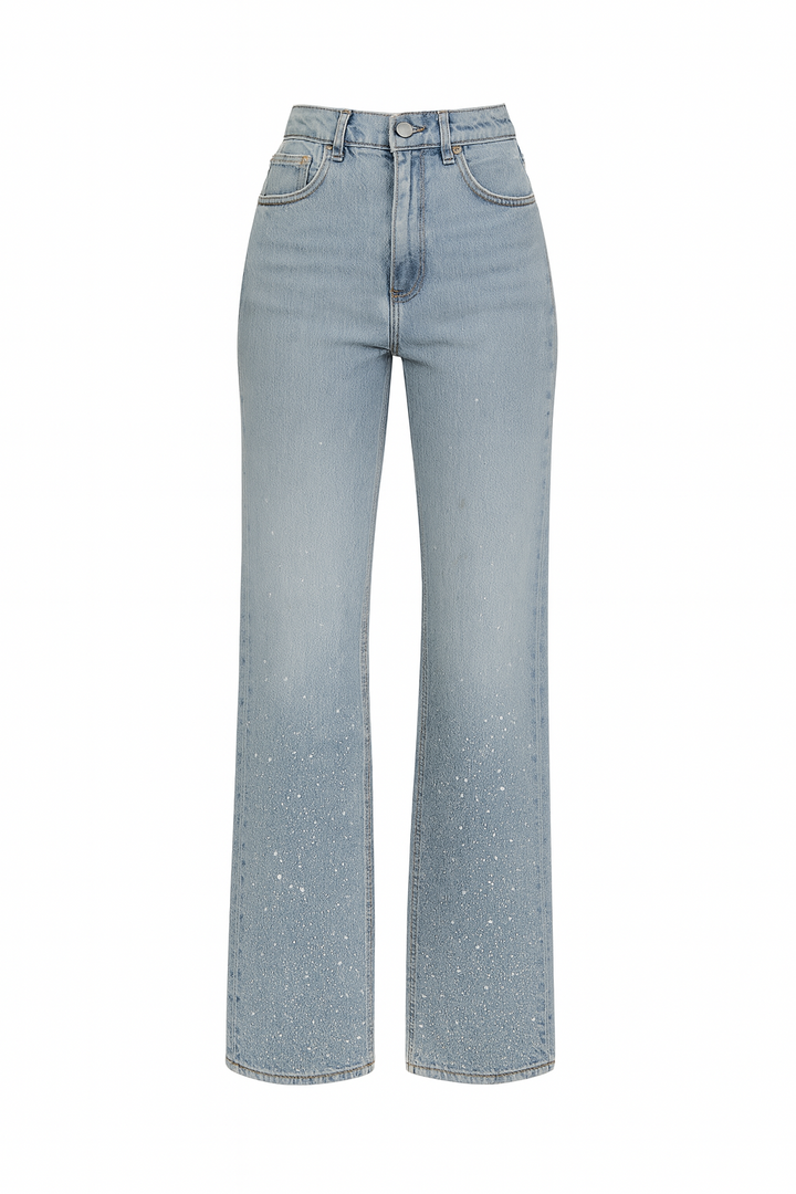 jean tiro alto de silueta recta, intervenido con aplicaciones brillantes en la parte inferior, que añaden un aire sofisticado y llamativo.