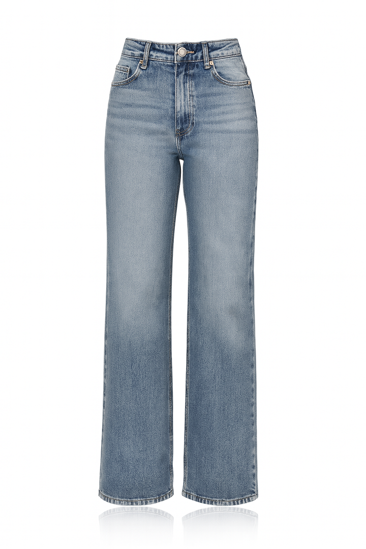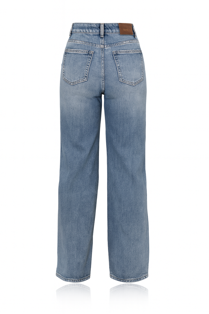 Jean de tiro alto con corte wide leg en denim azul medio. Su silueta amplia y fluida estiliza la figura, brindando comodidad y un toque moderno a cualquier look. La tela es suave, con textura firme y un acabado clásico que nunca pasa de moda.