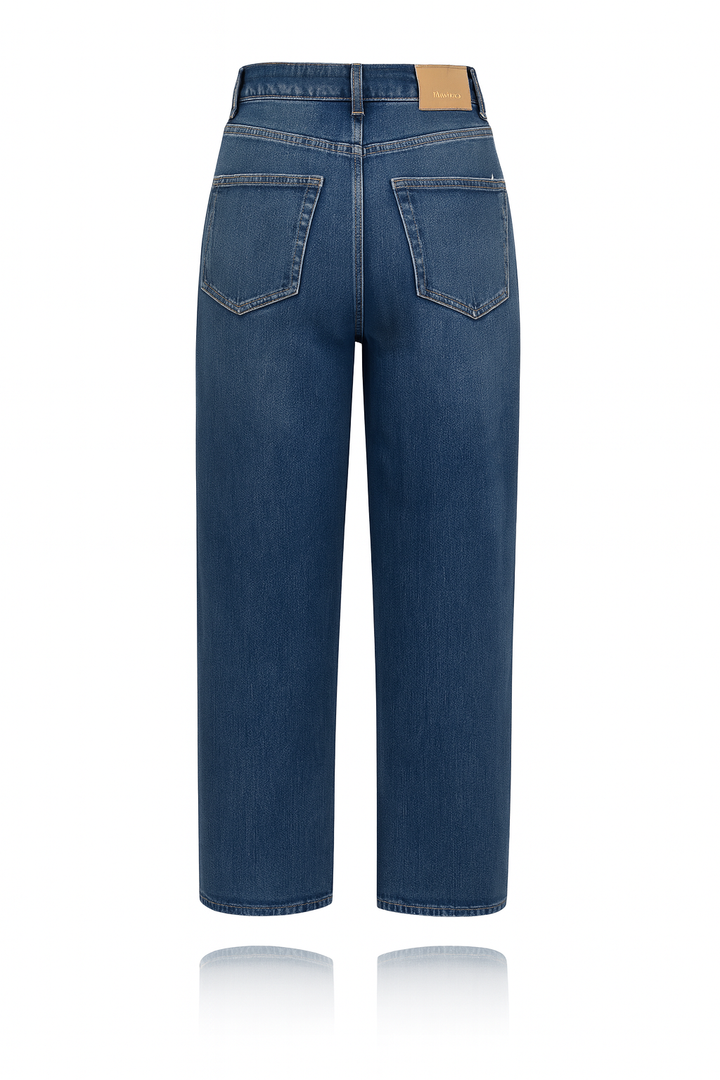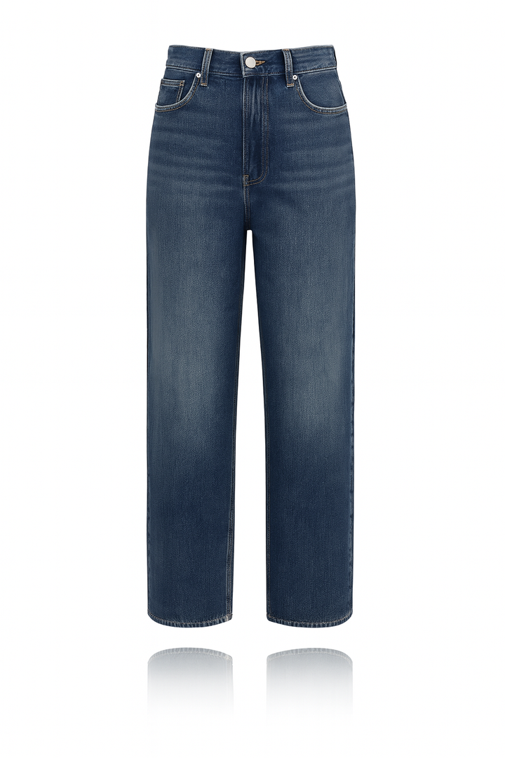 Este es un jean tiro alto de bota ancha, con un estilo relajado y moderno que alarga visualmente la figura. Su denim azul medio tiene un leve efecto desgastado que le da un toque casual y versátil.