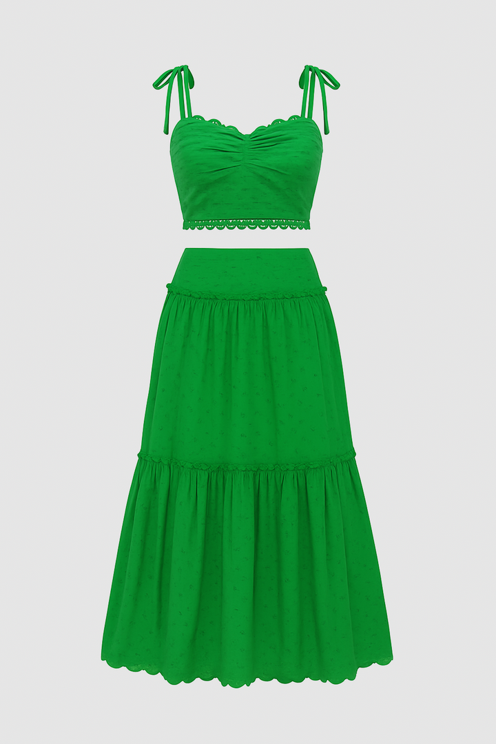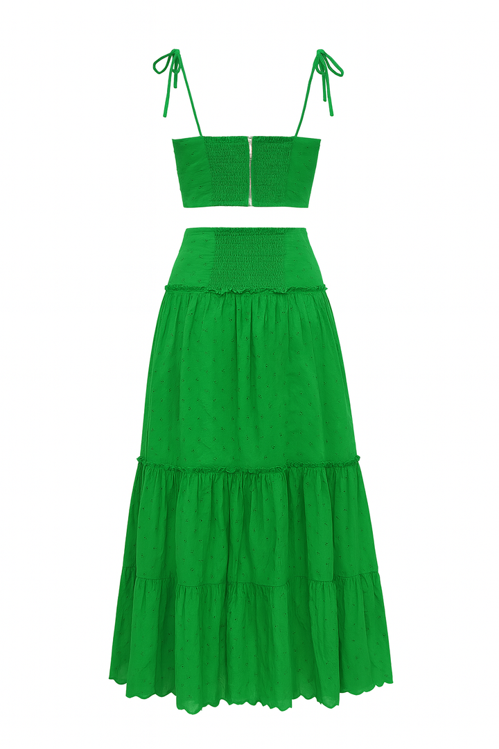 Conjunto verde de dos piezas en tela tipo ojalillo. El top cuenta con tiras ajustables y delicado borde calado, mientras la falda larga presenta caída amplia y ligera con detalle fruncido. Una propuesta fresca, femenina y cómoda, ideal para días soleados, salidas casuales o escapadas de verano.