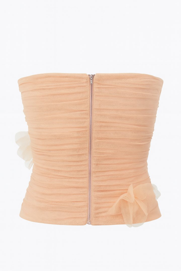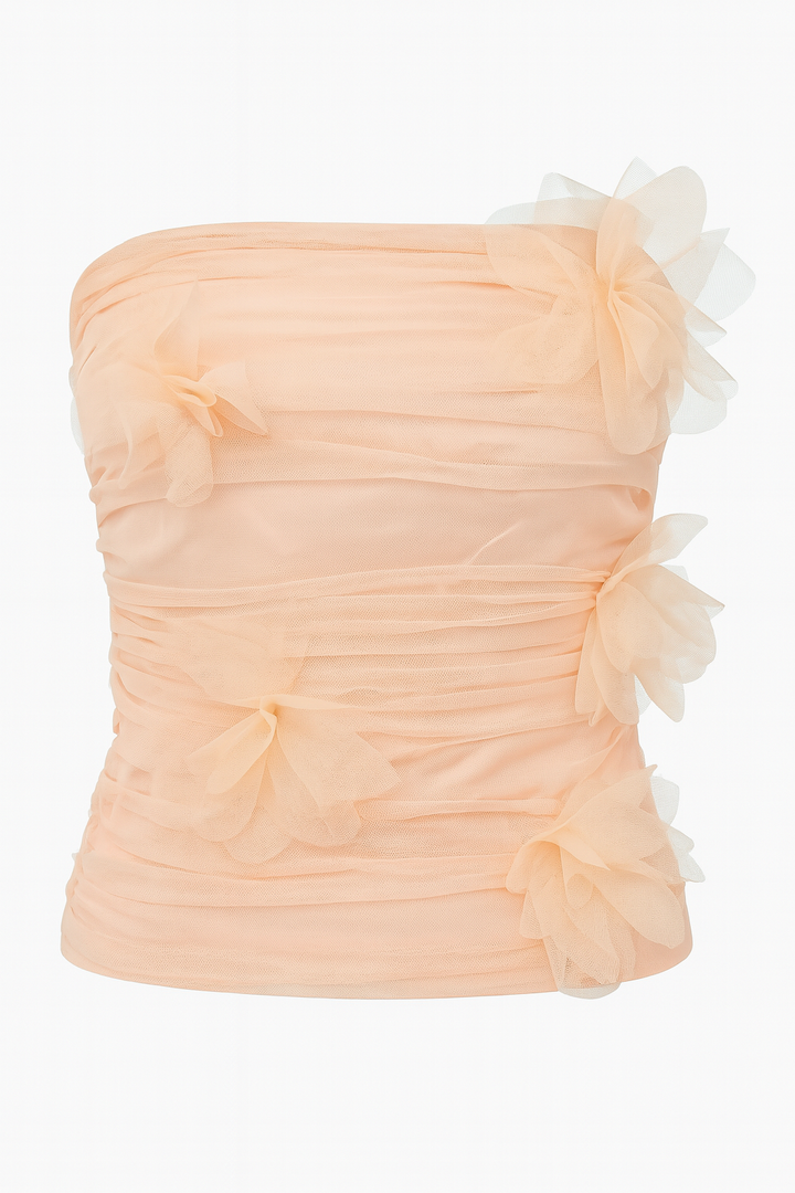 Blusa en tul durazno con flores 3D y frunces delicados. Ajuste ceñido y cierre posterior. Femenina y elegante para eventos o salidas especiales.