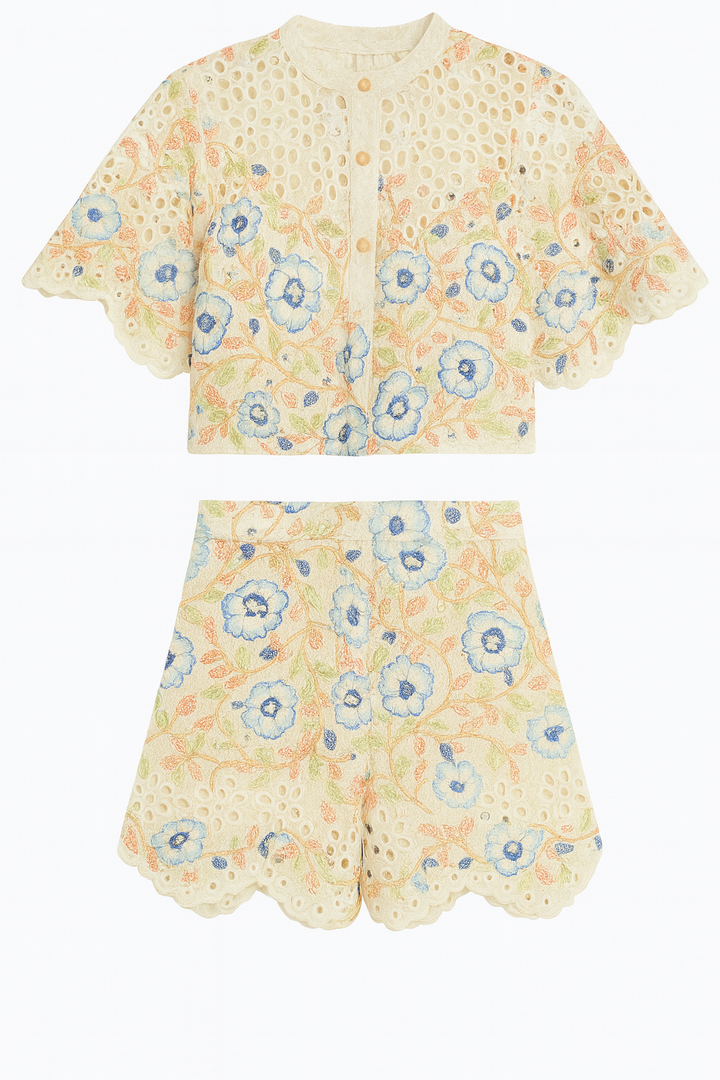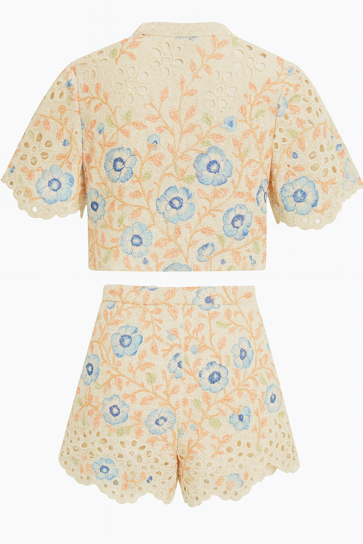 Set de blusa y short en encaje tipo ojalillo con bordado floral azul y durazno sobre fondo crema. Detalle calado, bordes scallop y botones al tono para un acabado limpio. Ideal para eventos de día, brunch o vacaciones.