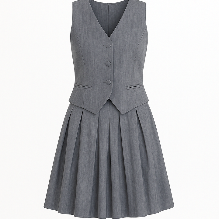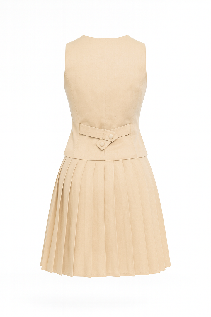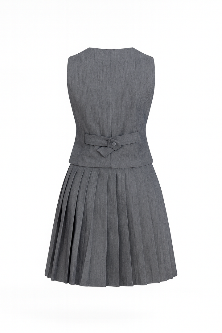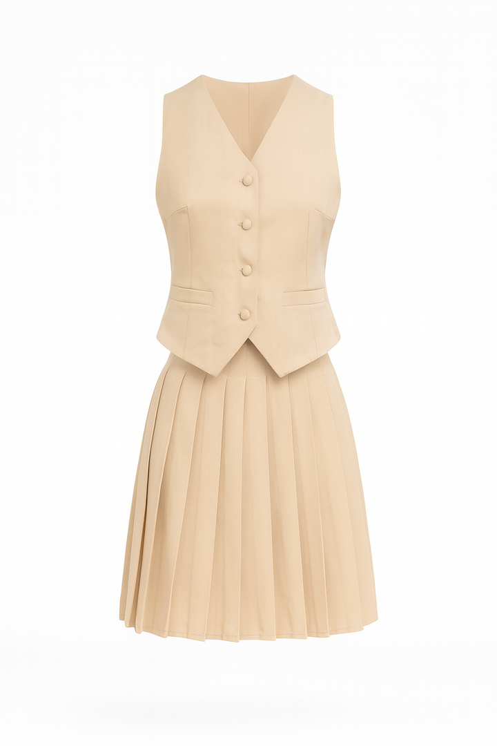 Set elegante con chaleco estructurado y falda tableada. Detalles en botones forrados y ajuste posterior. Perfecto para un look sofisticado y moderno de día.