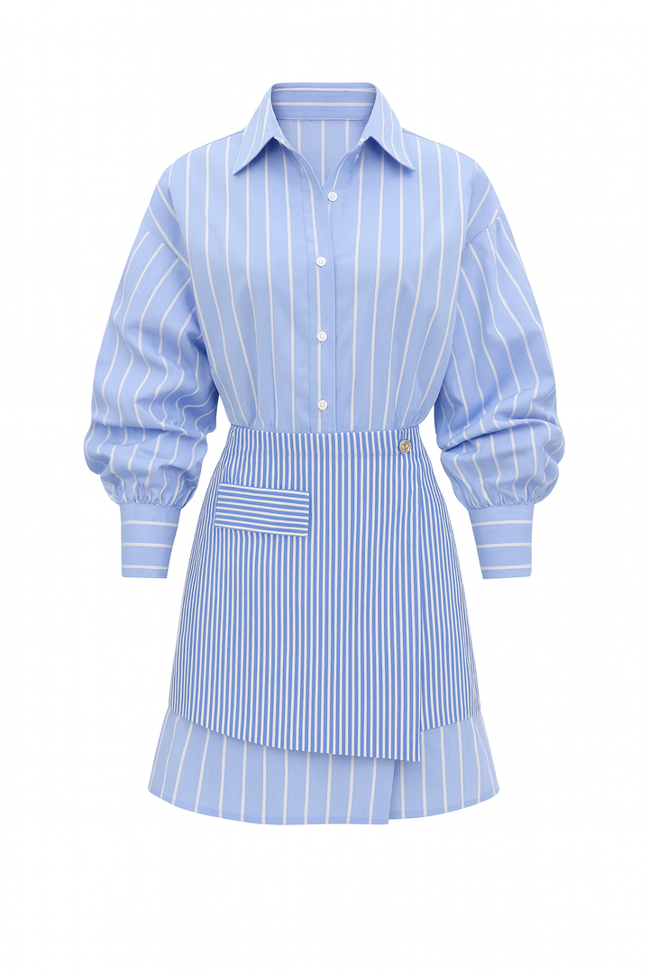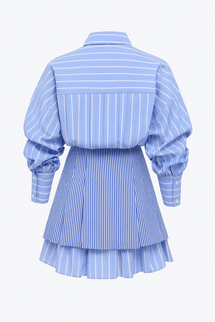 Vestido tipo camisa en algodón celeste con rayas blancas. Presenta mangas globo, cuello clásico y falda plisada con contraste de direcciones. Cómodo, moderno y perfecto para looks casuales o de oficina con un toque sofisticado.