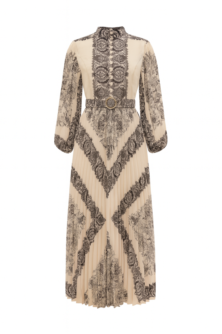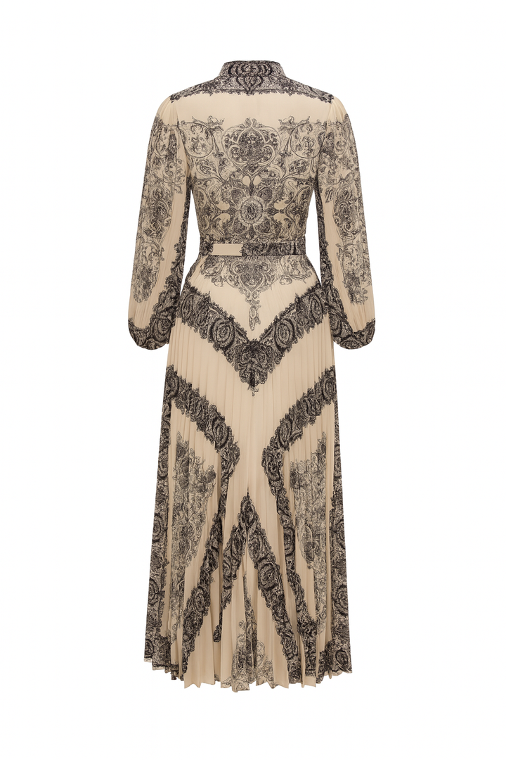 Set largo en tono beige con estampado barroco negro, cuello alto y mangas largas. Su falda plisada y cinturón con hebilla realzan la silueta con elegancia clásica.