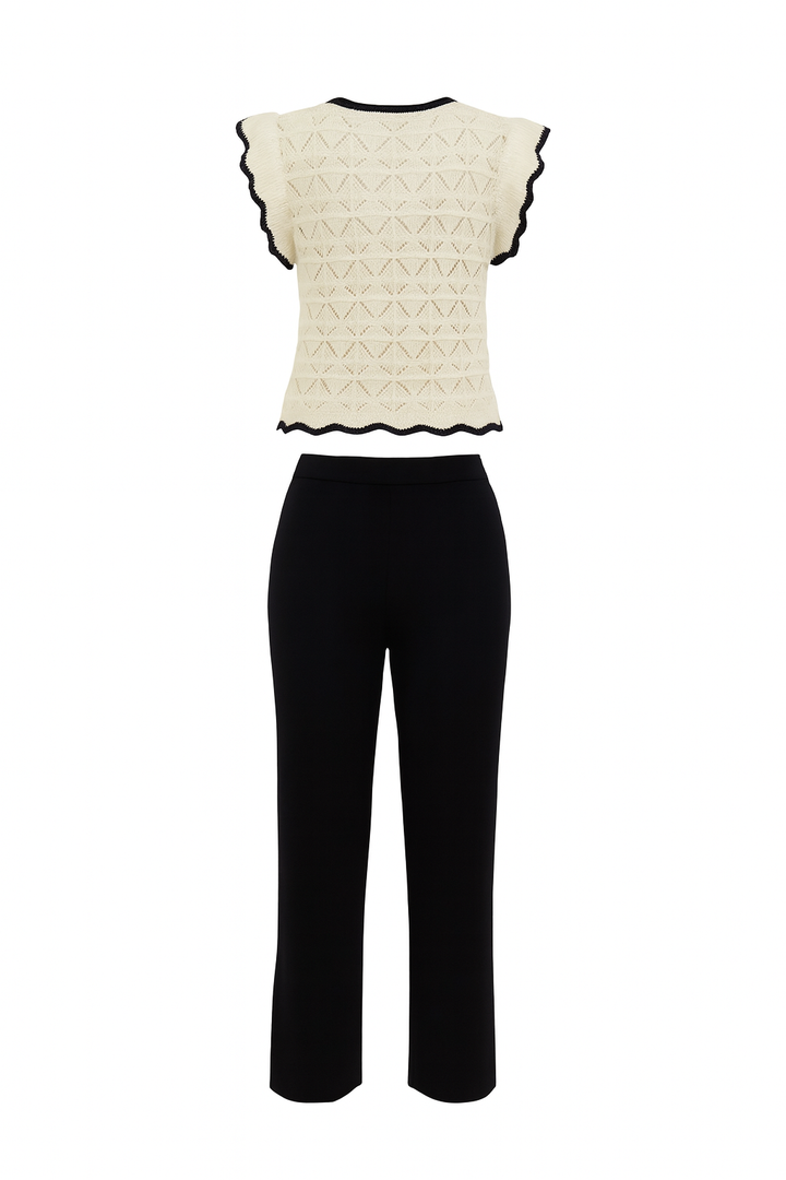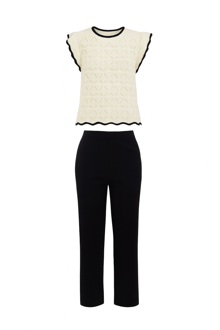 Set compuesto por blusa tejida color crema con delicado diseño calado y ribetes negros en cuello y mangas, acompañado de pantalón recto negro de caída suave. Ideal para un look clásico y versátil, perfecto para oficina o encuentros casuales con estilo.