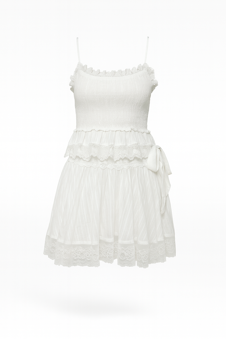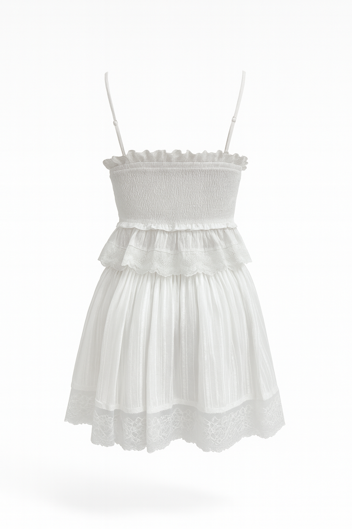 Set blanco con encanto romántico, su top de tirantes finos con nido de abeja y falda con encaje crean un look fresco, delicado y femenino. Perfecto para días soleados, brunch o planes casuales con estilo.