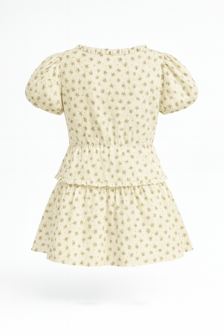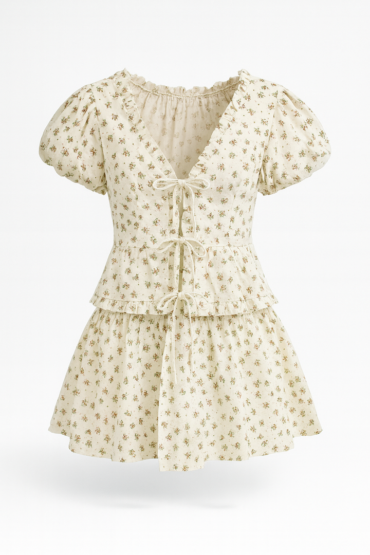 Set floral con aire romántico, compuesto por blusa de lazos frontales y falda corta con vuelo. Su estampado delicado y textura liviana lo hacen ideal para días cálidos, paseos o planes al aire libre. Femenino, fresco y encantador.