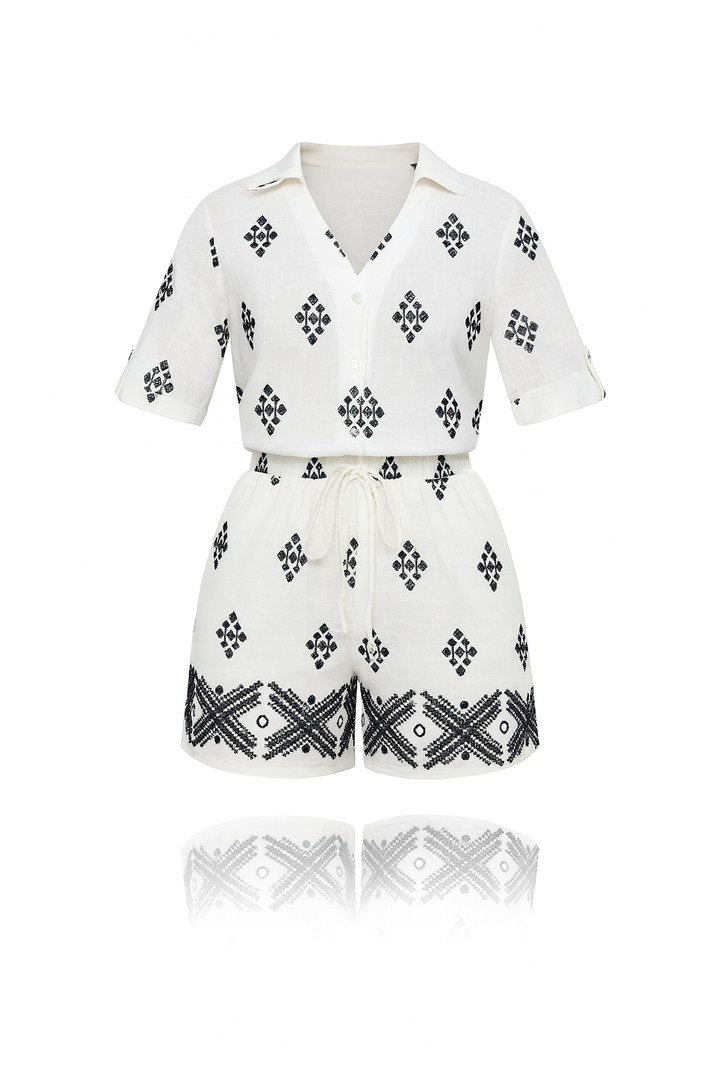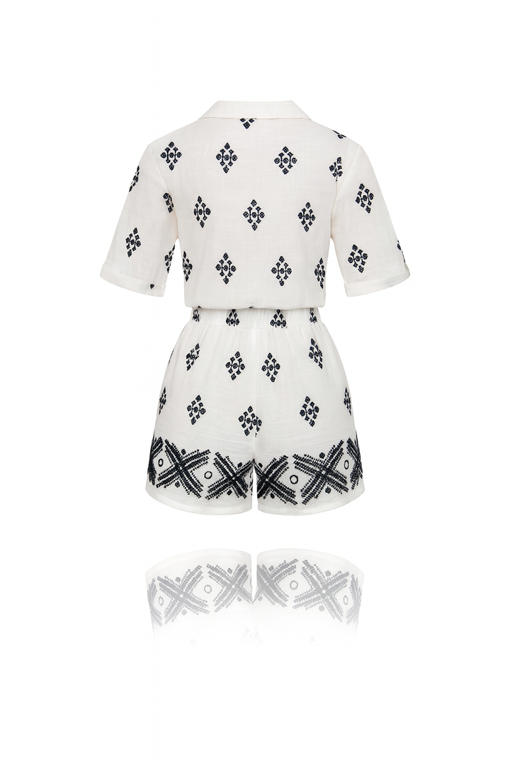Set en lino blanco con bordados negros y corte relajado. Ligero, fresco y cómodo, ideal para días cálidos o escapadas de fin de semana con estilo natural.