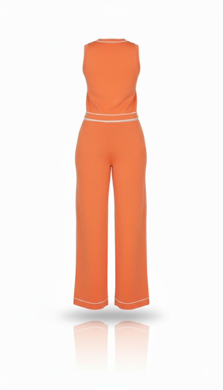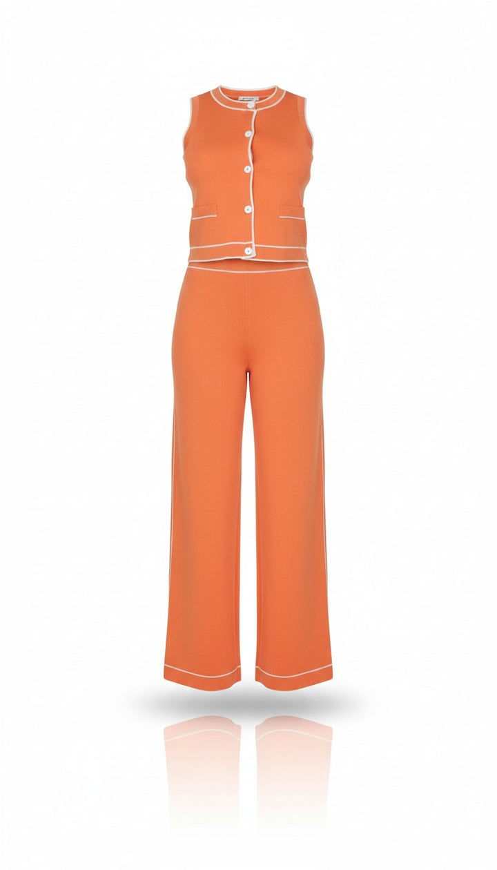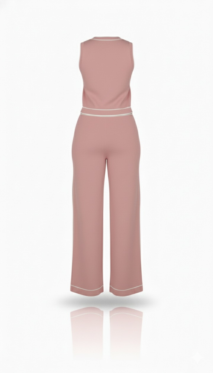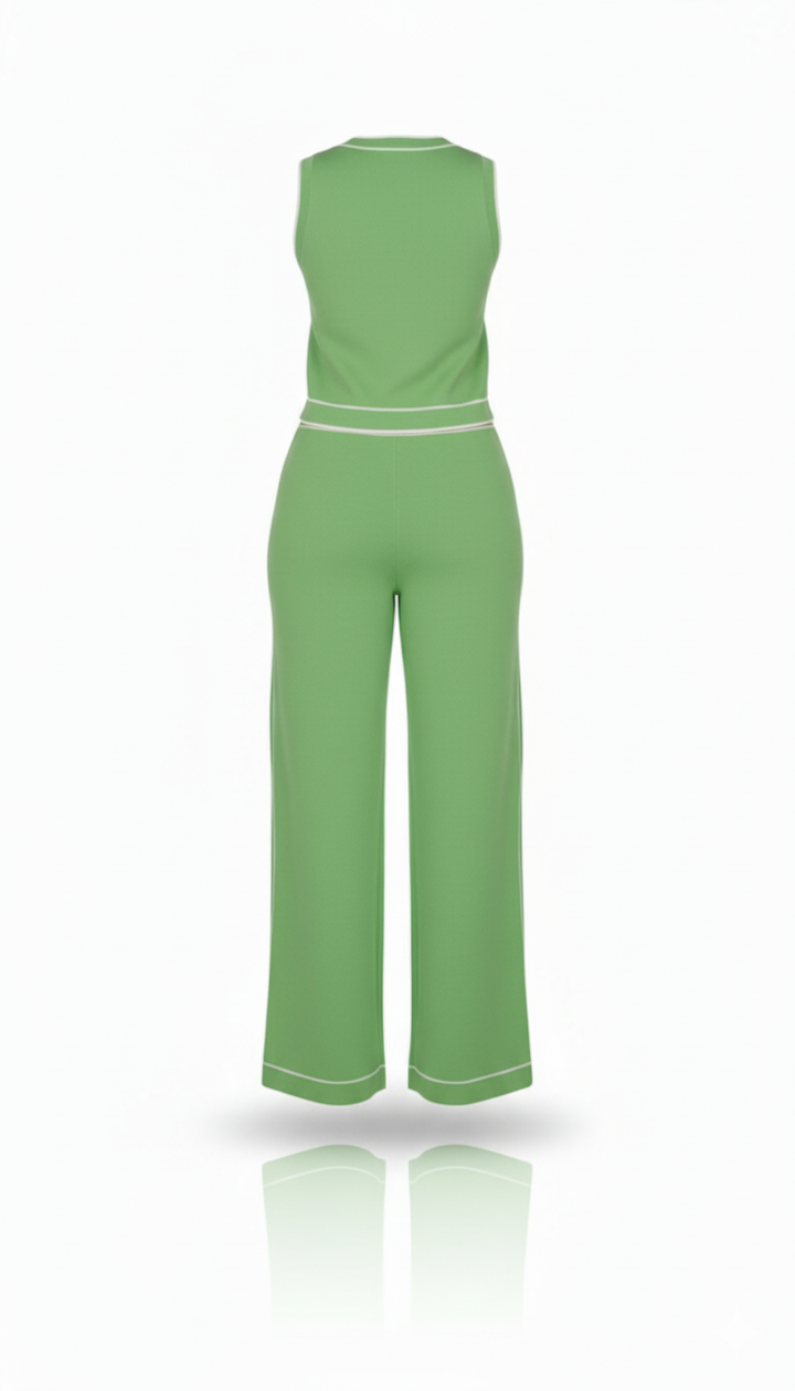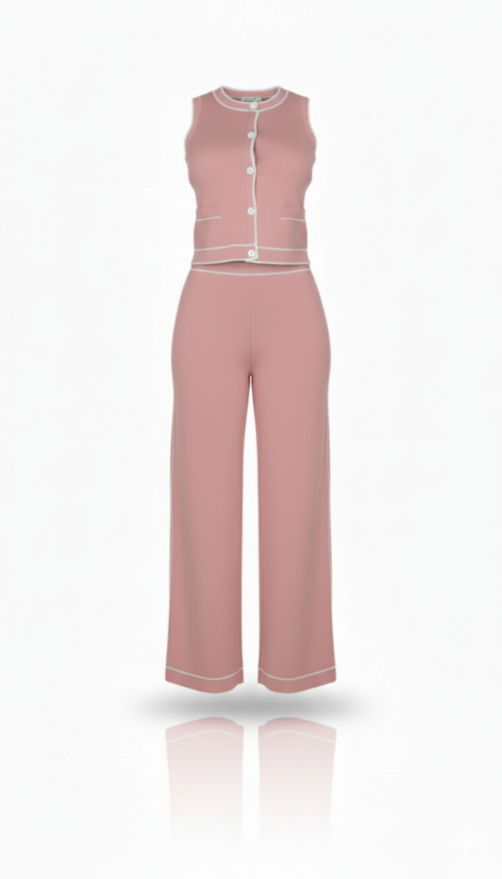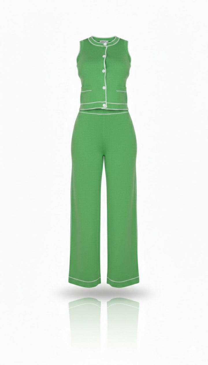 Set viajero tejido con detalles blancos y botones frontales. Su estilo moderno y cómodo es ideal para un look casual con un toque elegante.