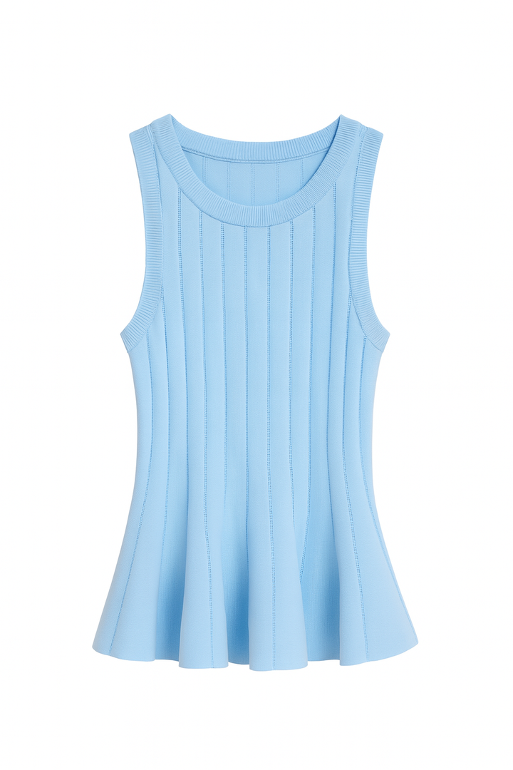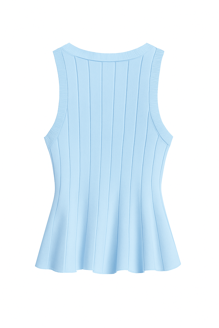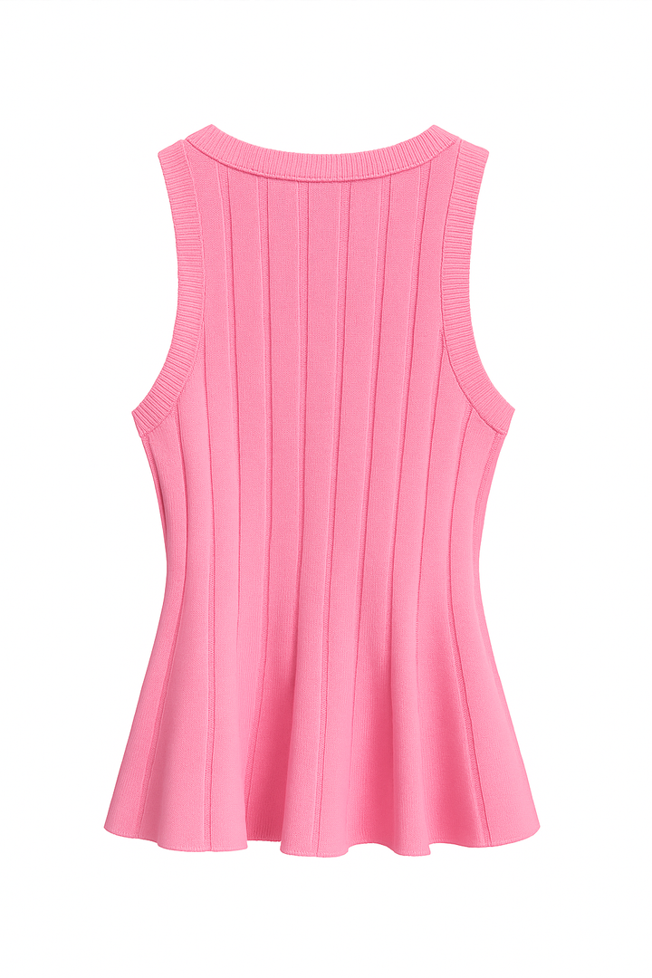Top sin mangas en punto acanalado, de corte ajustado y caída ligera, ideal para un look fresco y femenino. COD: