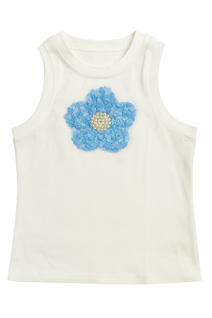 Top blanco de algodón con una flor rosada en lentejuelas y centro de perlas. Su diseño fresco y delicado aporta un toque femenino y encantador, ideal para looks casuales con estilo.