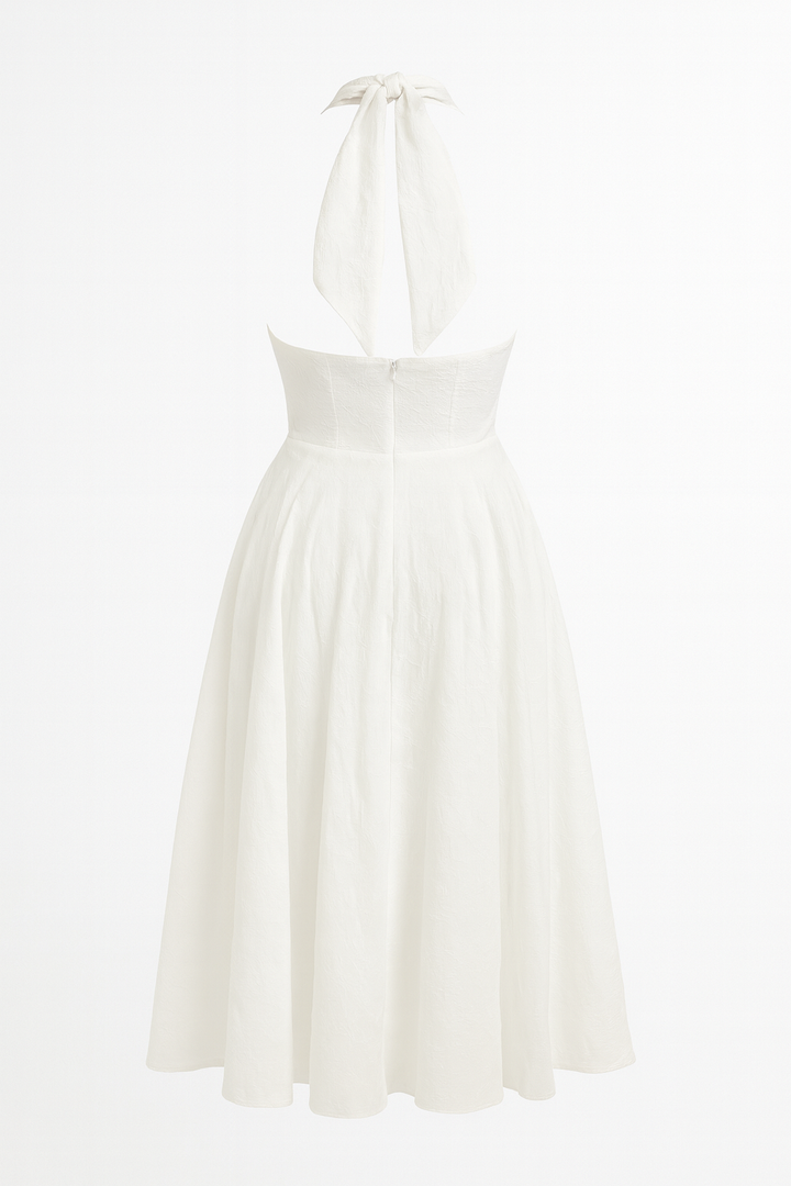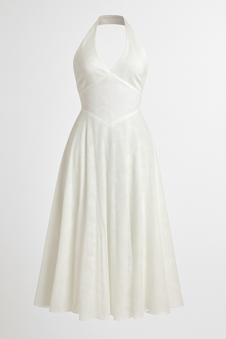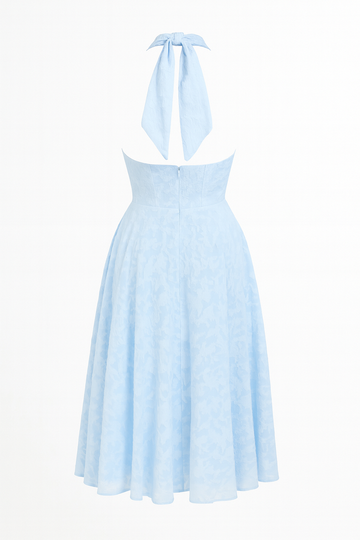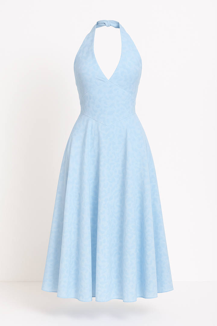 Vestido midi en tono pastel con escote halter y falda de vuelo. Confeccionado en un tejido ligero con sutil textura, ofrece un ajuste favorecedor y elegante. Perfecto para eventos formales o semi-formales.