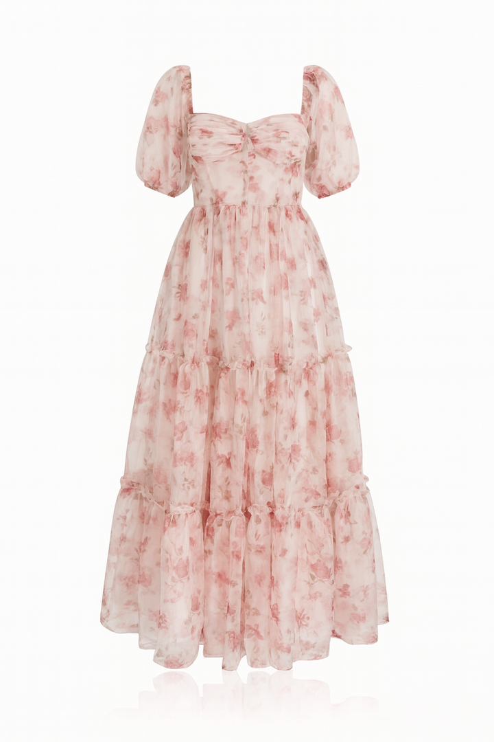 Vestido largo con estampado floral y mangas abullonadas. Su diseño romántico y ligero es ideal para eventos de día o celebraciones al aire libre.