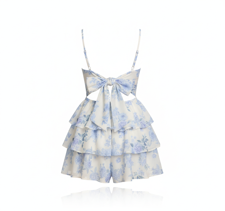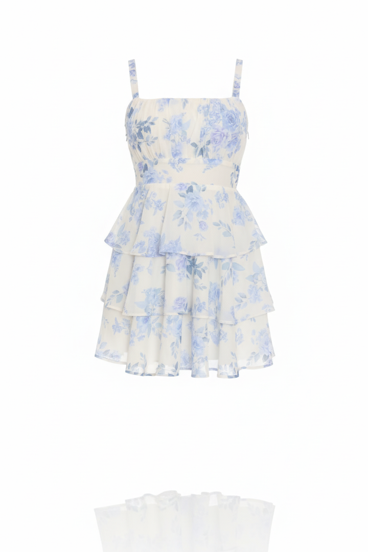 Vestido corto lleno de frescura y encanto. Su estampado floral en tonos celeste y blanco resalta la delicadeza femenina, mientras sus capas en vuelo crean un movimiento romántico y ligero. Perfecto para días soleados, brunch con amigas.