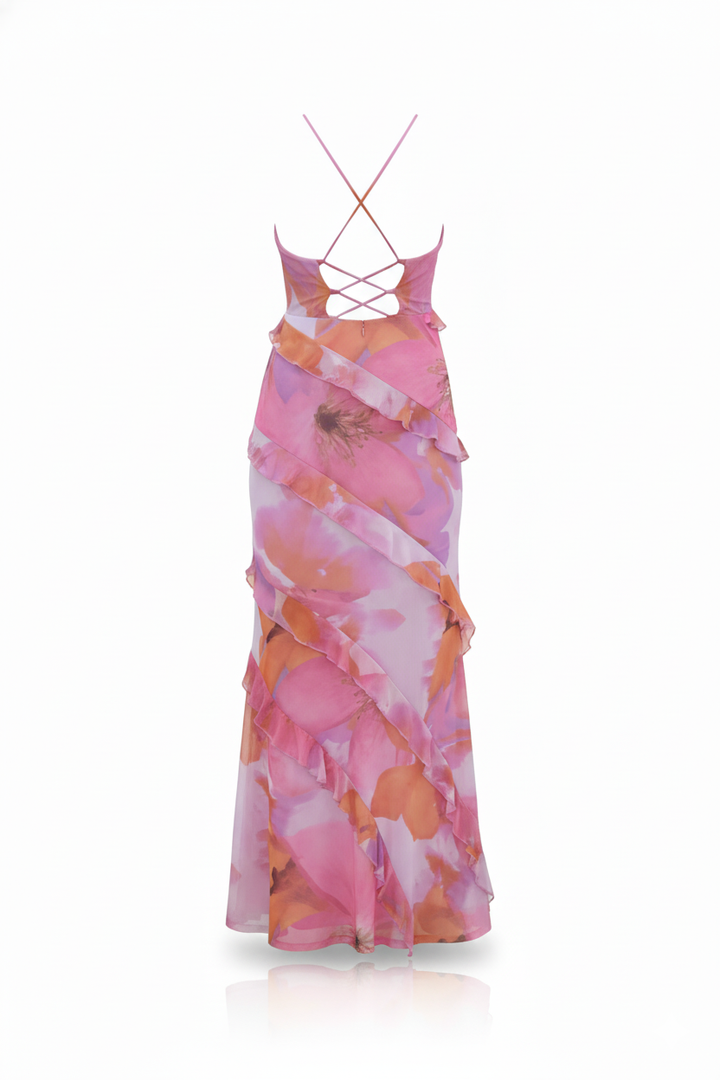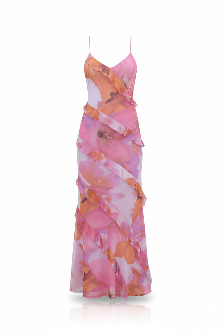 Vestido largo con estampado floral en tonos rosados y naranjas. Su diseño con volantes diagonales y tiras finas crea una silueta romántica y fresca, perfecta para eventos de verano o cenas al aire libre.