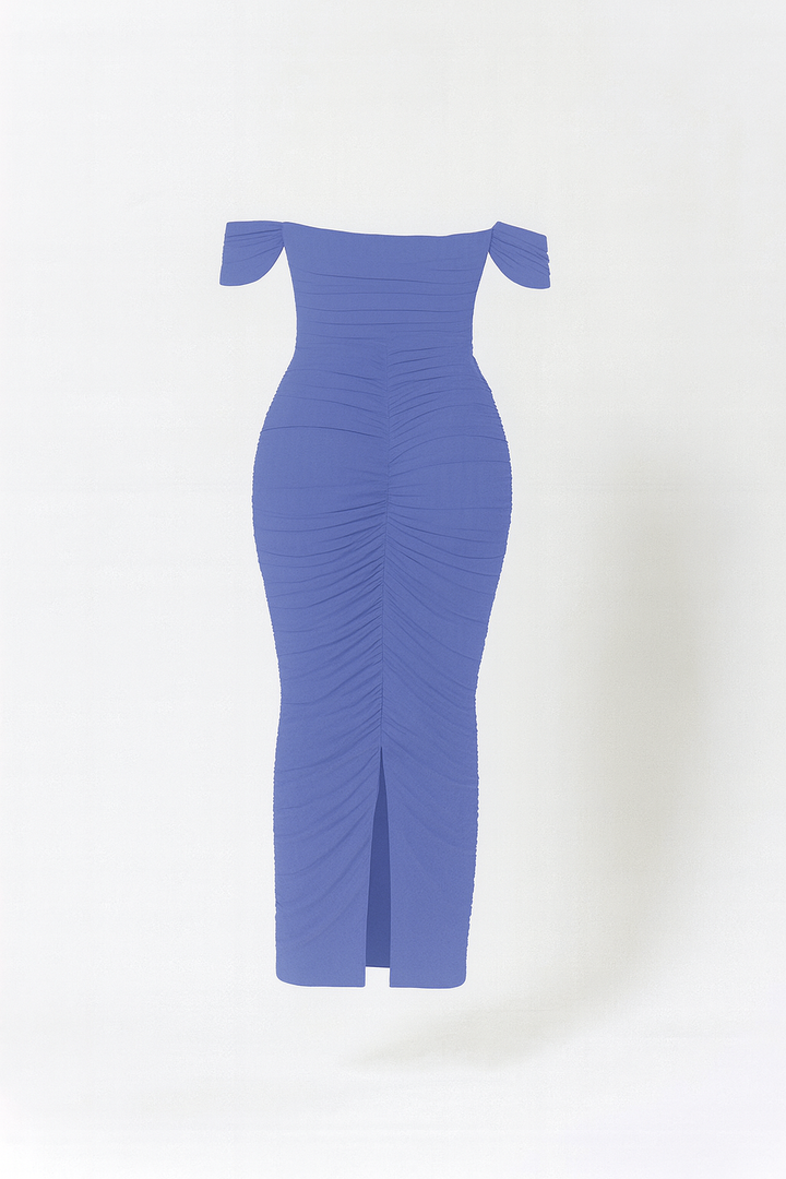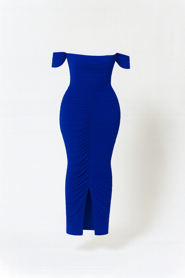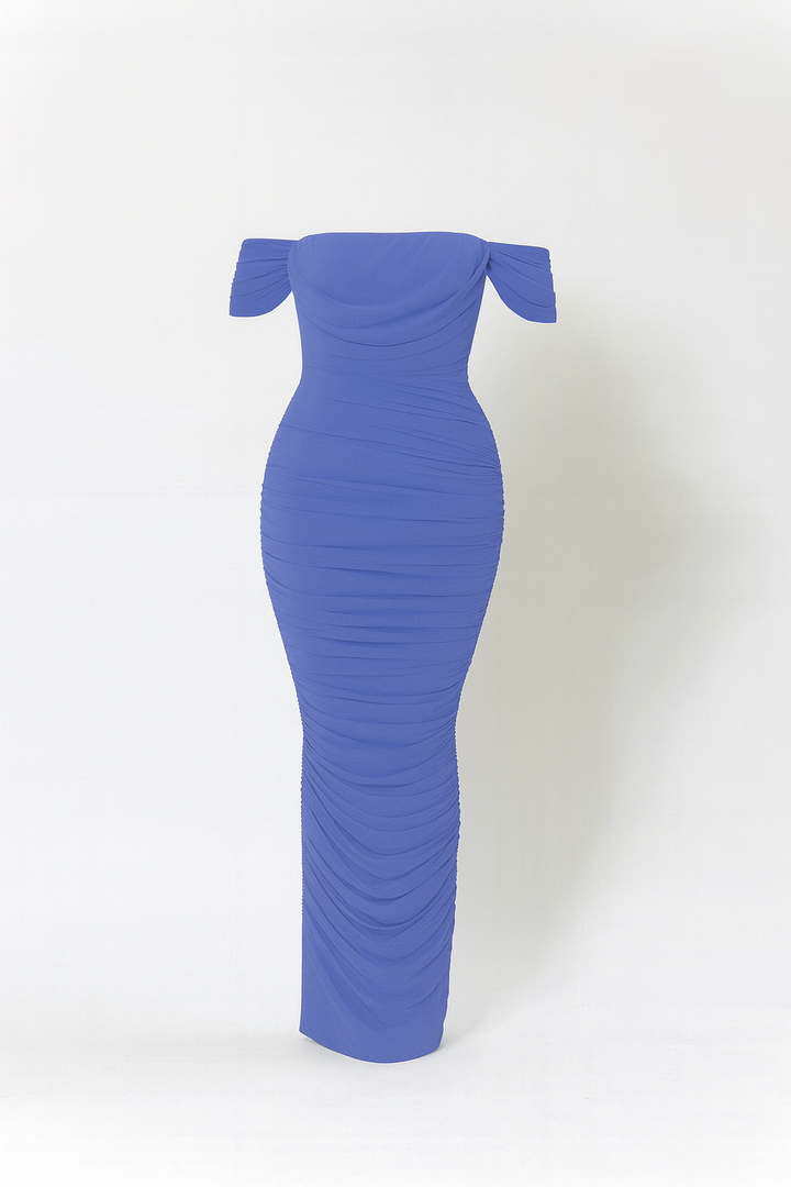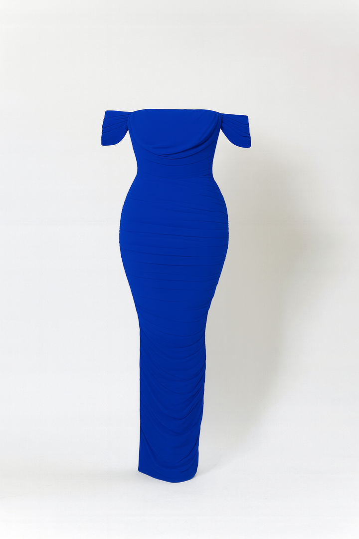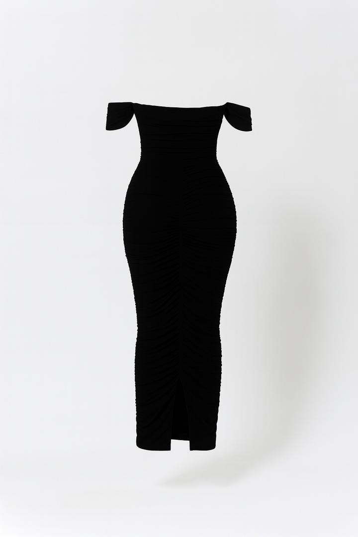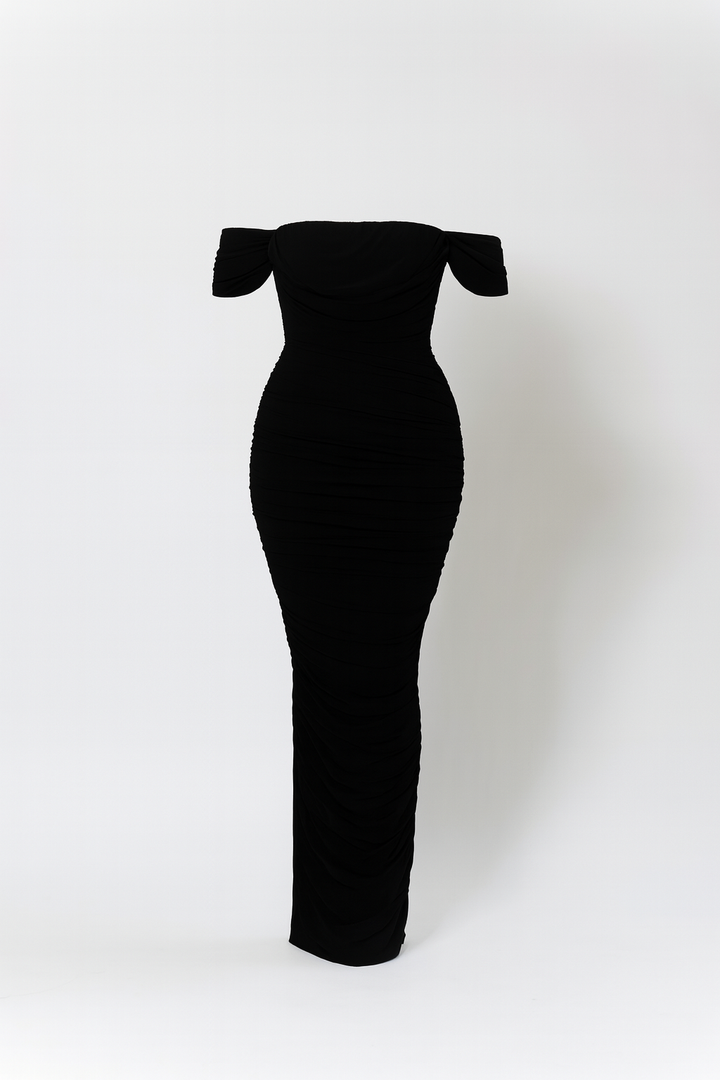 Vestido largo negro drapeado, con diseño strapless y mangas caídas que resaltan los hombros. Su silueta ajustada estiliza la figura, creando un look elegante y sofisticado ideal para la noche.