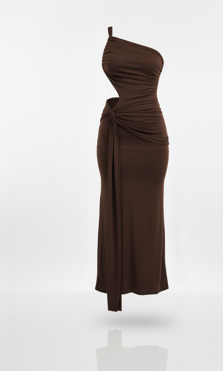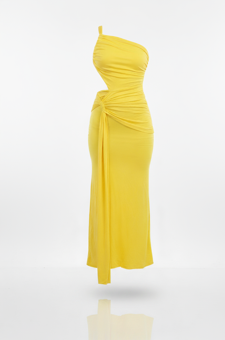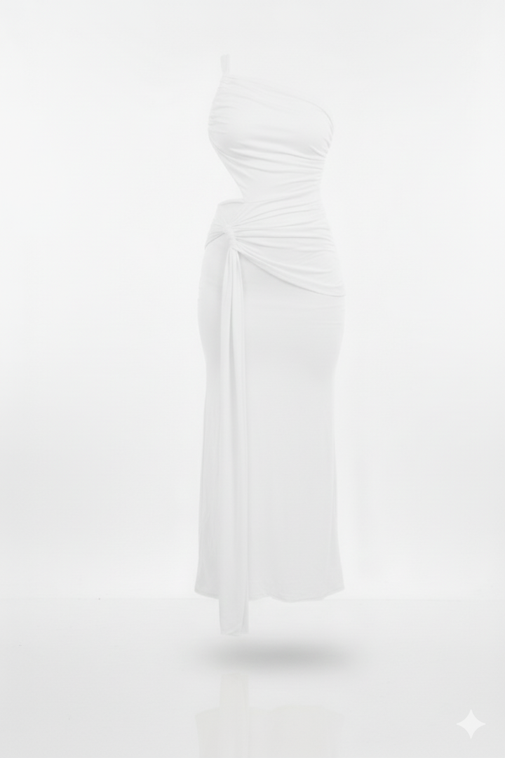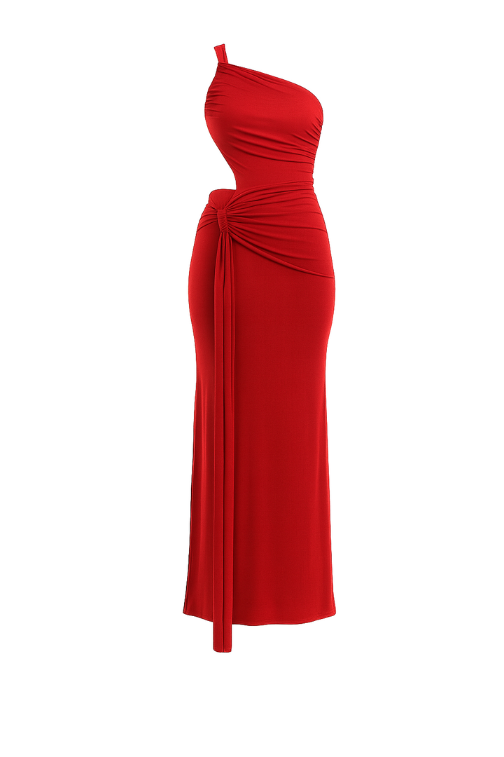 Vestido de un hombro con corte lateral y drapeado elegante, ideal para lucir sofisticada en cualquier evento especial.