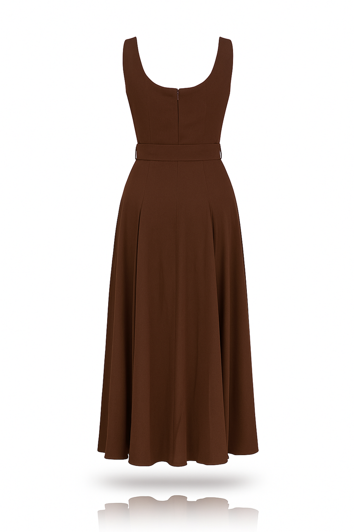 Vestido largo color chocolate, con silueta fluida y escote recto que realza la figura. Su cinturón con hebilla dorada aporta un toque elegante y femenino. Perfecto para cenas, eventos o una ocasión especial donde quieras destacar con estilo y sofisticación.