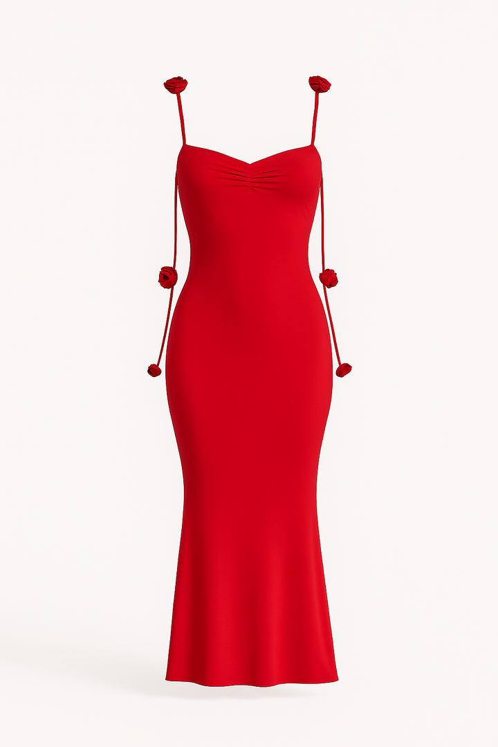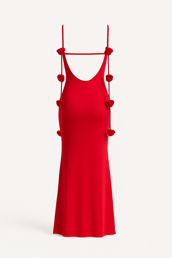 Este vestido con flores rojas realza tu estilo con un toque vibrante y femenino. Perfecto para cualquier ocasión, su diseño atractivo te asegura destacar con elegancia.