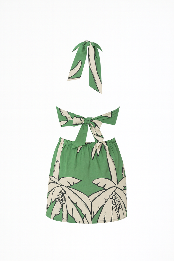 Vestido corto con estampado tropical, confeccionado en tela ligera. Diseño halter con detalle de nudo en la cintura que realza la silueta. Ideal para un look fresco y sofisticado.