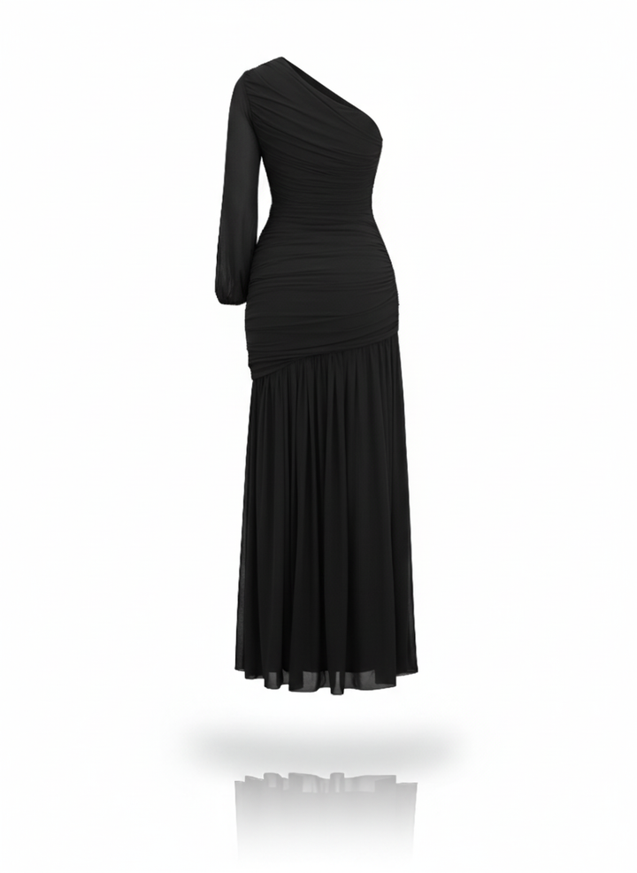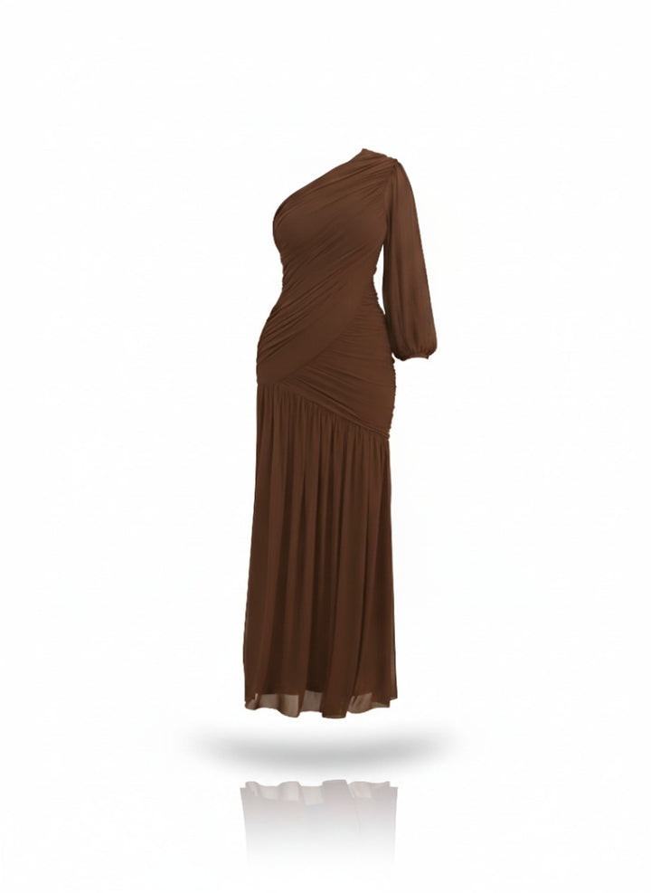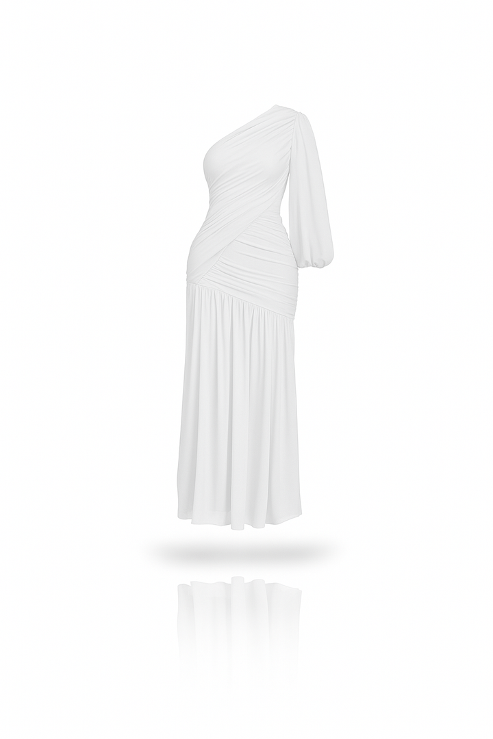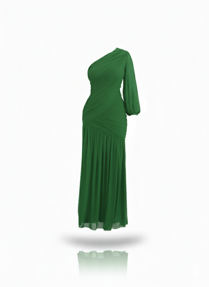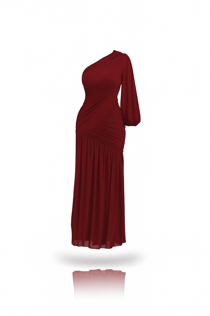 Vestido realza la silueta con sutileza y movimiento. Su escote asimétrico de un solo hombro y manga larga abullonada aportan un toque sofisticado y moderno, mientras el drapeado diagonal estiliza la figura y la falda fluida da una caída ligera y femenina.