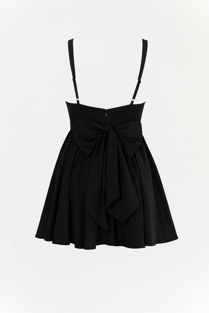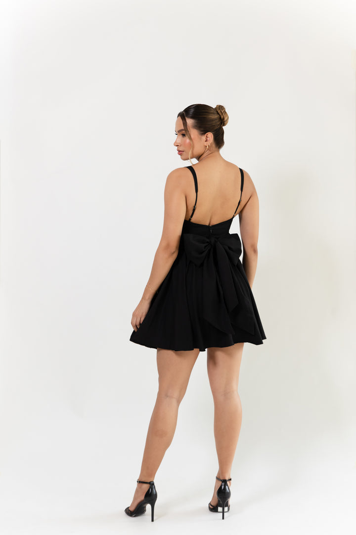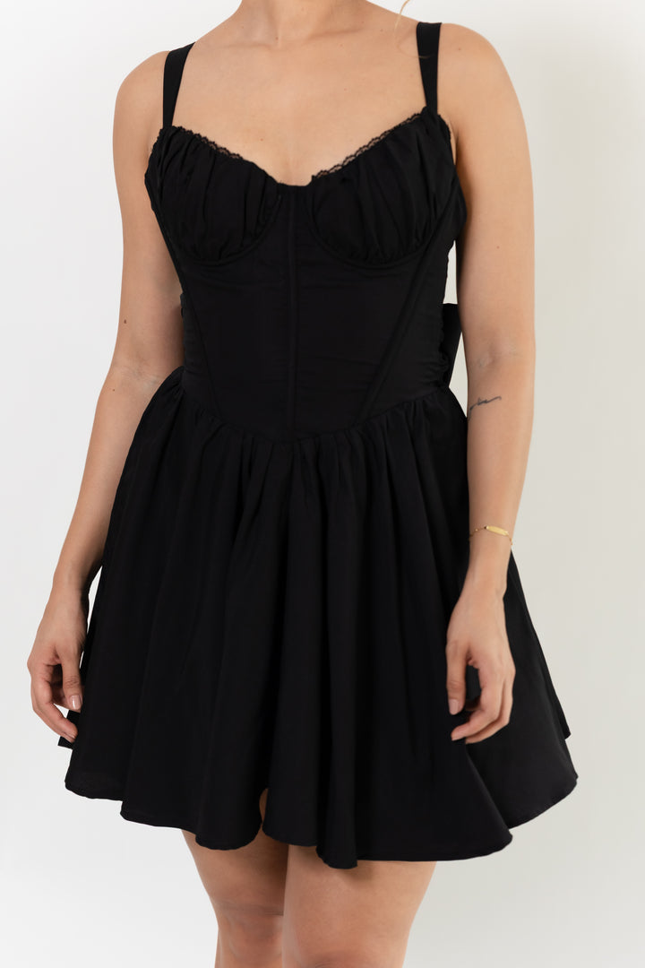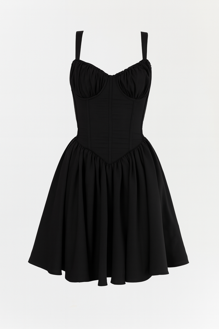 Vestido corto negro con corset estructurado y falda amplia en vuelo. Un diseño femenino y sofisticado que resalta la silueta con estilo y elegancia.