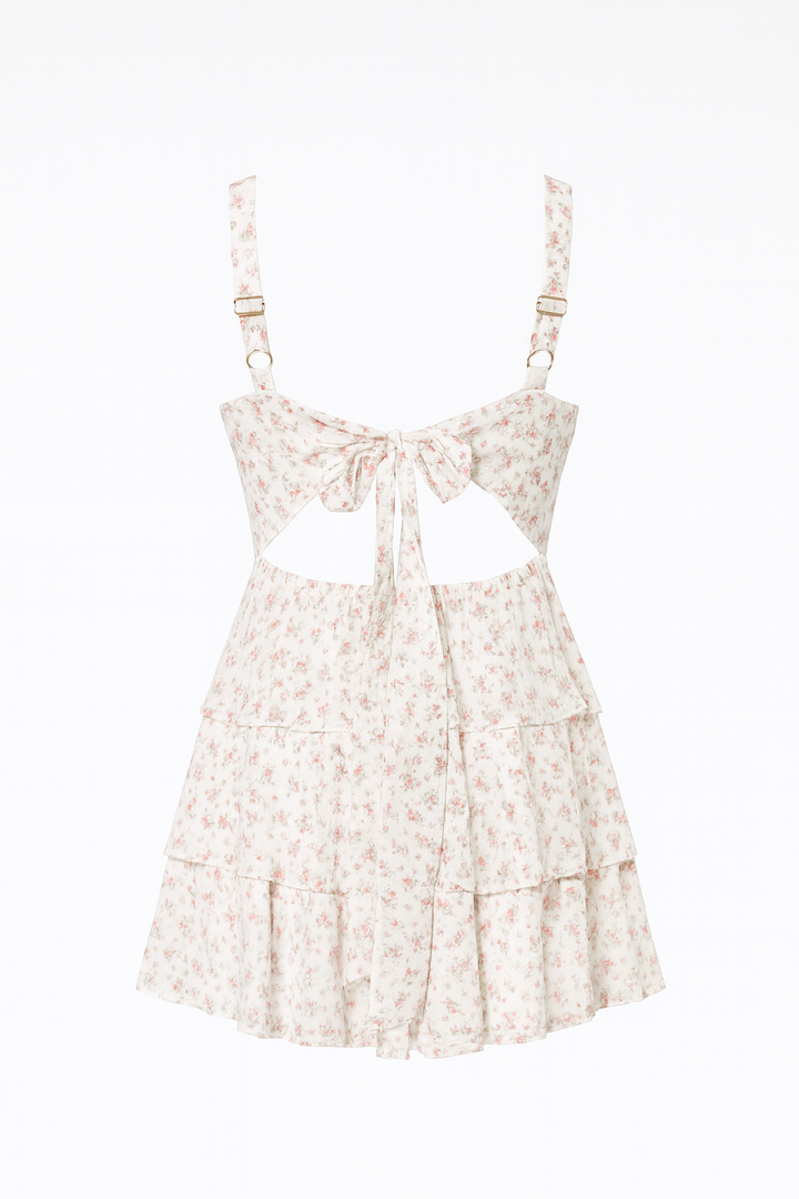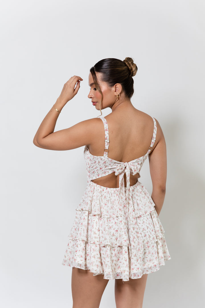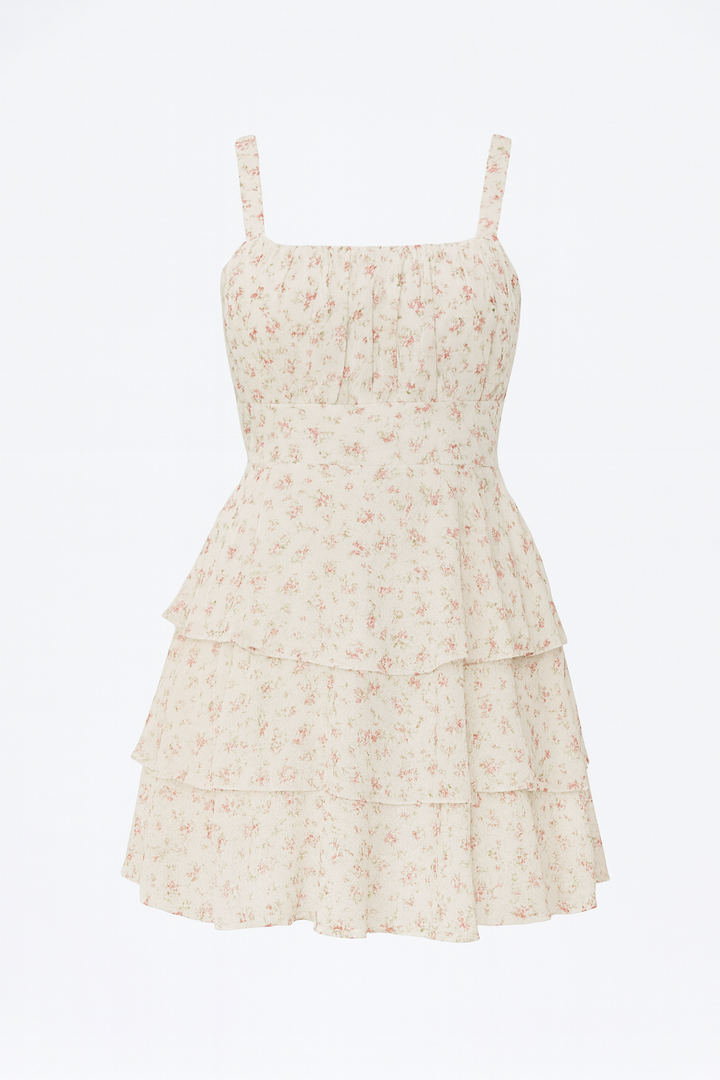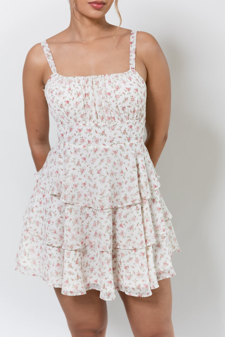 Vestido corto floral con tirantes y falda en volantes, fresco y romántico para un look femenino irresistible.