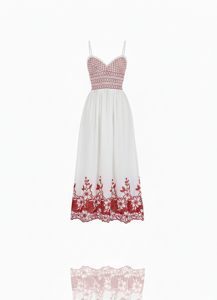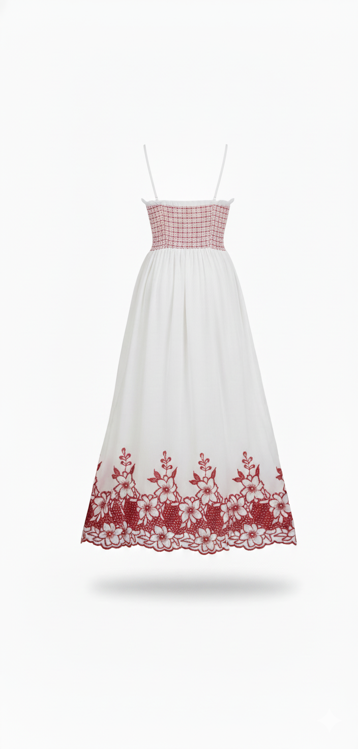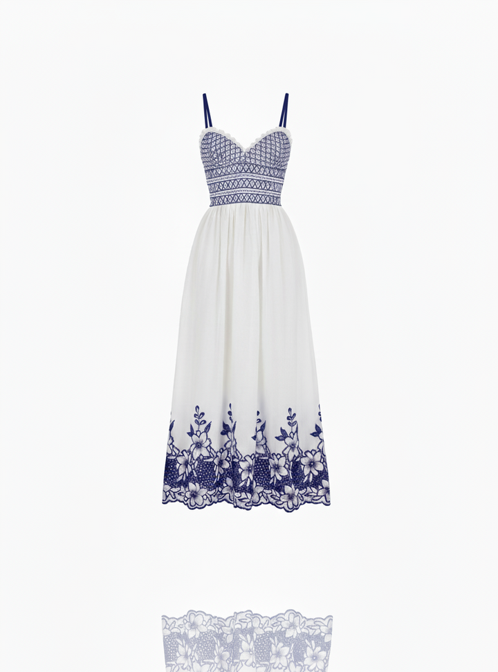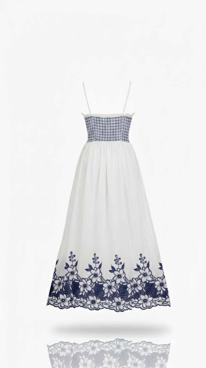 Vestido que evoca el encanto del Mediterráneo. Su corpiño bordado en azul combina con una falda fluida en tono marfil que cae con movimiento delicado. El contraste entre el bordado floral y la base blanca crea un look fresco, femenino y sofisticado.